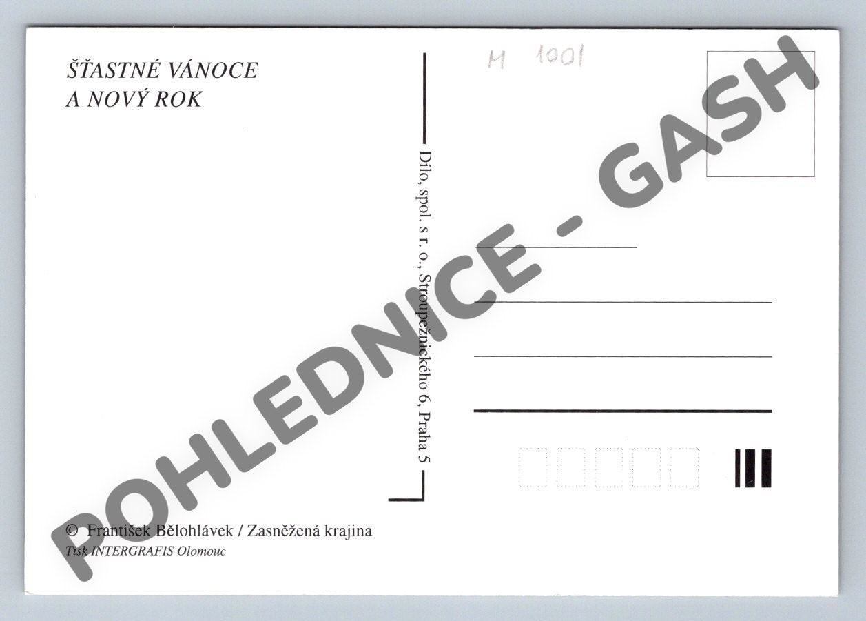 Krásná pohlednice s motivem zasněžené krajiny, autorem je František Bělohlávek. Na přední straně dominuje velký strom se žlutým listím ve sněhu, vedle něj postavy dospělého a dítěte na zimní procházce. V pozadí svítí měsíc na zimní obloze. Pohlednice je neprošlá, ve velmi dobrém stavu, s přáním Šťastné Vánoce a Nový rok na zadní straně. Vzadu jsou uvedeny informace o autorovi a tisku (Tisk INTERGRAFIS Olomouc). Formát pohlednice odpovídá vydání po roce 1950.