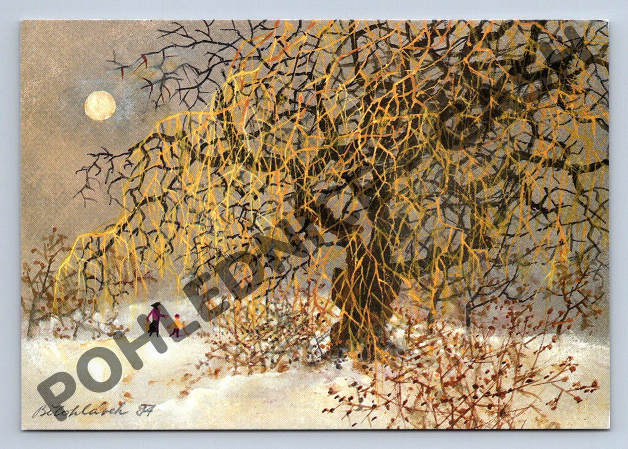Pohlednice s motivem zimní krajiny, autorem obrazu je František Bělohlávek. Na přední straně je malba sněhem pokryté krajiny s mohutným stromem pod měsícem na zimní obloze. Ve spodní části se prochází dvě postavičky po zasněžené stezce. Zadní strana pohlednice je určena pro odeslání, s tištěným textem Šťastné Vánoce a Nový rok. Vhodné jako sběratelský kousek či pro vánoční přání. Stav pohlednice je velmi dobrý, neprošlá poštou.