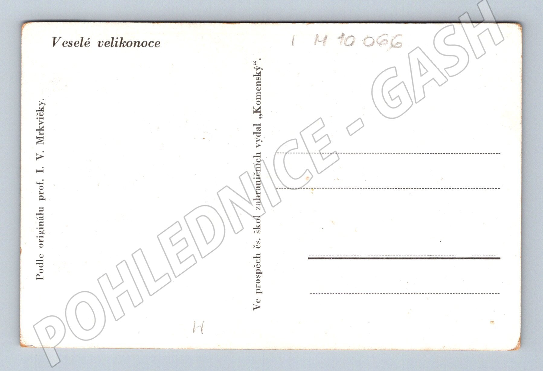 Velikonoční pohlednice s motivem dívky a koně pod rozkvetlou větví. Pohlednice je zpracována podle originálu profesora I. V. Mrkvičky a vydána ve prospěch českých škol zahraničních Komenský. Na přední straně je krásný malovaný velikonoční motiv, zadní strana je nepopsaná, s tištěným nápisem Veselé velikonoce . Pohlednice je ve velmi dobrém sběratelském stavu, vhodná pro milovníky historických pohlednic i tematických sbírek s motivem koní.