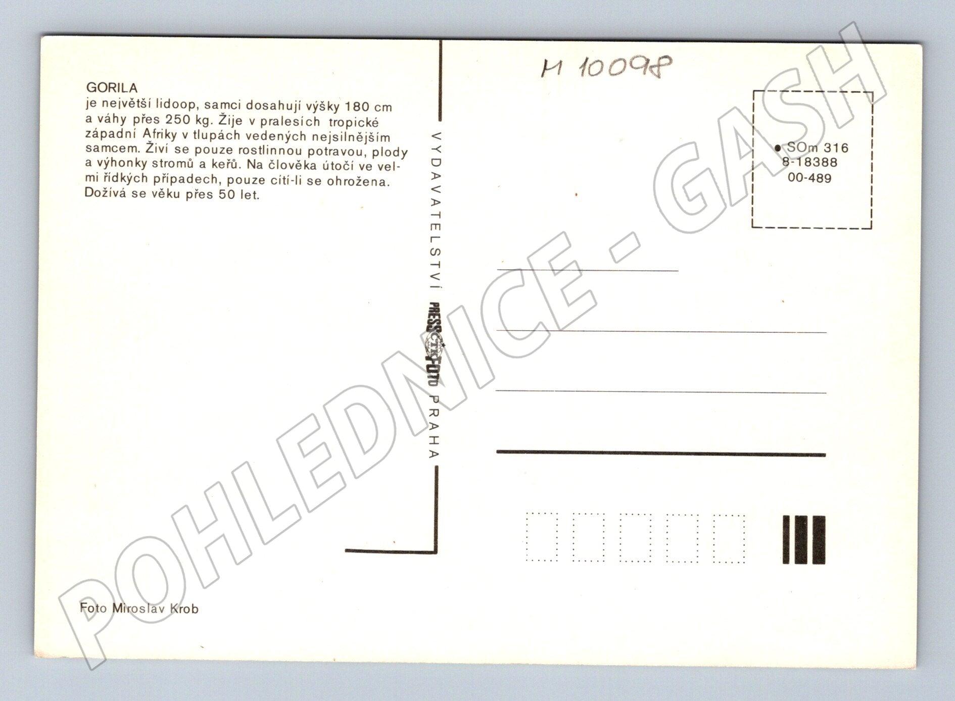 Nabízím originální pohlednici s fotografií gorily. Pohlednice zobrazuje tohoto největšího lidoopa – samec může dosáhnout výšky až 180 cm a váhy přes 250 kg. Gorily žijí ve skupinách v tropických pralesech západní Afriky, živí se výhradně rostlinnou potravou, hlavně plody a výhonky stromů a keřů. Na člověka útočí jen ve vzácných případech, když se cítí ohrožené. Gorily se dožívají více než 50 let. Pohlednice je ve velmi dobrém stavu, vhodná pro sběratele i milovníky zvířat. Na zadní straně informace o gorile, foto Miroslav Krob, vydavatelství Pressfoto Praha.