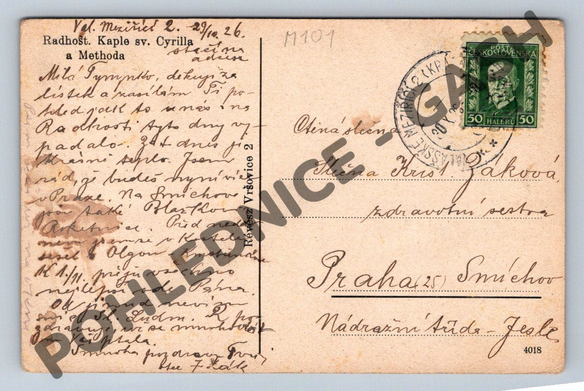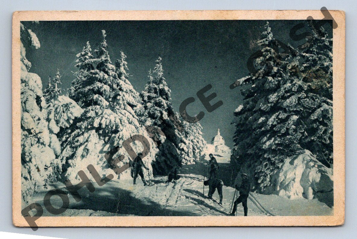 Originální stará pohlednice s motivem zimní krajiny na Radhošti, Kaple sv. Cyrila a Metoděje. Pohlednice je opatřena poštovní známkou z období první republiky a prošla poštou roku 1926 (razítko Meziříčská). Na přední straně je krásná černobílá fotografie zasněženého lesa s postavami na lyžích, v pozadí kaple. Na zadní straně ručně psaná zpráva a adresa adresátky v Praze (Smíchov). Velmi pěkný sběratelský stav, autentická dobová atmosféra.