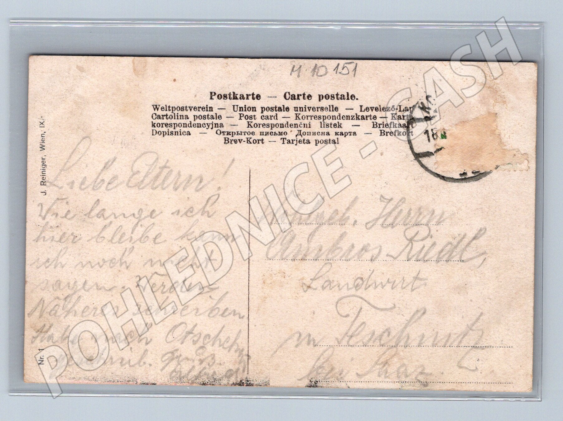 Originální historická pohlednice z období Rakousko-Uherska s názvem Letzter Knödel! (Poslední knedlík). Na přední straně je kresba vojáka v uniformě, který si s úsměvem salutuje a chystá se naporcovat velký knedlík. Pohlednice je již prošlá poštou, na zadní straně najdete ručně psaný vzkaz v německém jazyce a poštovní razítko s patrným datem. Vhodné pro sběratele humorných, vojenských či rakousko-uherských pohlednic. Stav viz foto, potisk a barvy velmi dobré, drobné známky stáří na okrajích. Skvělý kousek do sbírky!