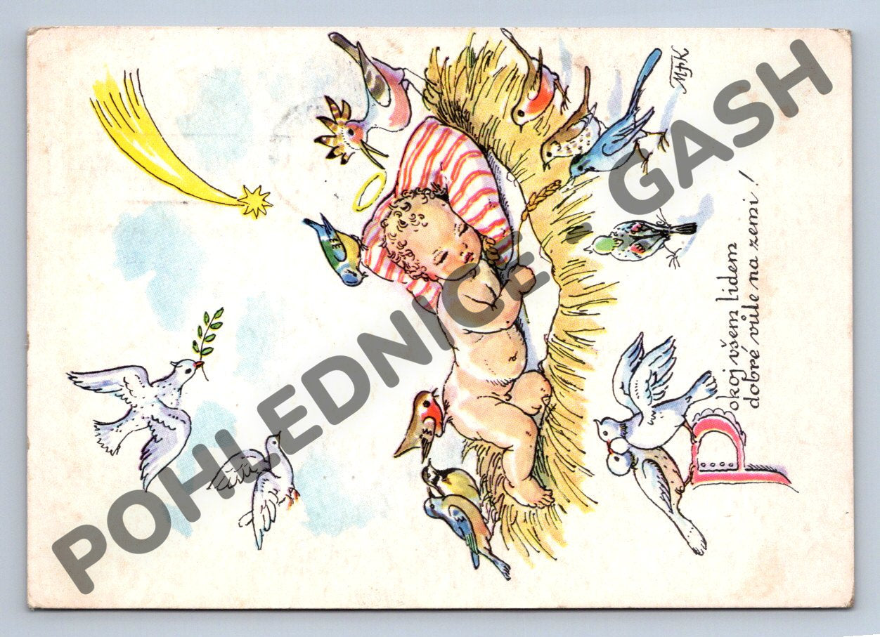Originální stará vánoční pohlednice z Československa, malý formát (do roku 1950). Na přední straně je krásná barevná ilustrace od M. Fischerové-Kvěchové zobrazující Ježíška v jesličkách obklopeného ptáčky a kometou. Vhodná sběratelská pohlednice nebo krásný přírůstek do tematické sbírky s vánočním motivem a lidovým uměním. Zadní strana obsahuje ručně psaný i tištěný vzkaz, adresu a známku s razítkem Praha z roku 1950. Celkově velmi dobrý stav odpovídající stáří. Atraktivní ukázka českých ilustrovaných pohlednic první poloviny 20. století.