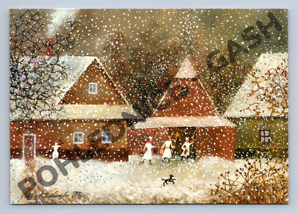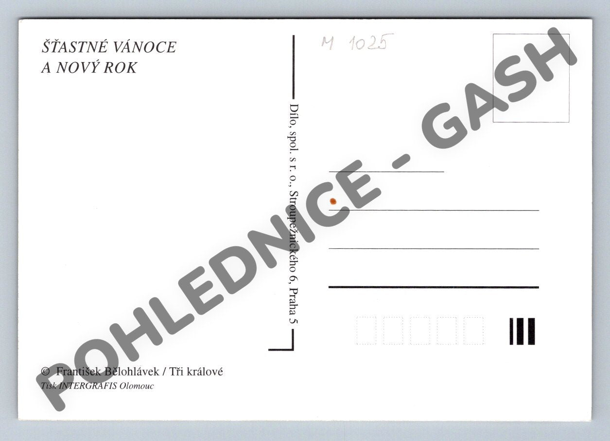 Vánoční pohlednice s motivem zimní vesnické krajiny. Na obrázku jsou zobrazeny tradiční chalupy se zasněženými střechami, v popředí postavy dětí a sněhulák. Jemný nostalgický zimní výjev doplňují motivy tří králů a hrajících si dětí. Na rubu pohlednice je tištěné přání ŠŤASTNÉ VÁNOCE A NOVÝ ROK. Autor motivu: František Bělohlávek, tisk INTERGRAFIS Olomouc. Pohlednice je v perfektním stavu, nepopsaná, vhodná pro sběratele i k dalšímu poslání.