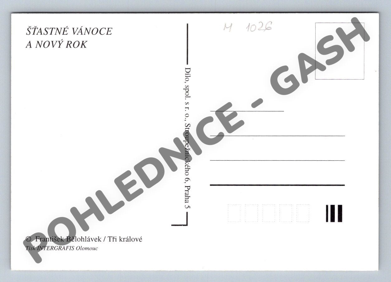 Nabízím krásnou vánoční pohlednici s motivem zasněžené vesnické chalupy, dětí a tradičních Tří králů. Pohlednice byla vytvořena Františkem Bělohlávkem, je nevypisaná a ve skvělém stavu. Na přední straně je idylická zimní krajina s domy pod sněhovou pokrývkou, kouřící komín a postavičky v tradičních krojích. Zadní strana je určena pro popis a poštovní známku, nese tištěné přání ŠŤASTNÉ VÁNOCE A NOVÝ ROK . Velký formát vhodný jak do sbírky, tak pro odeslání jako vánoční přání. Česká tvorba, tisk INTERGRAFIS Olomouc.
