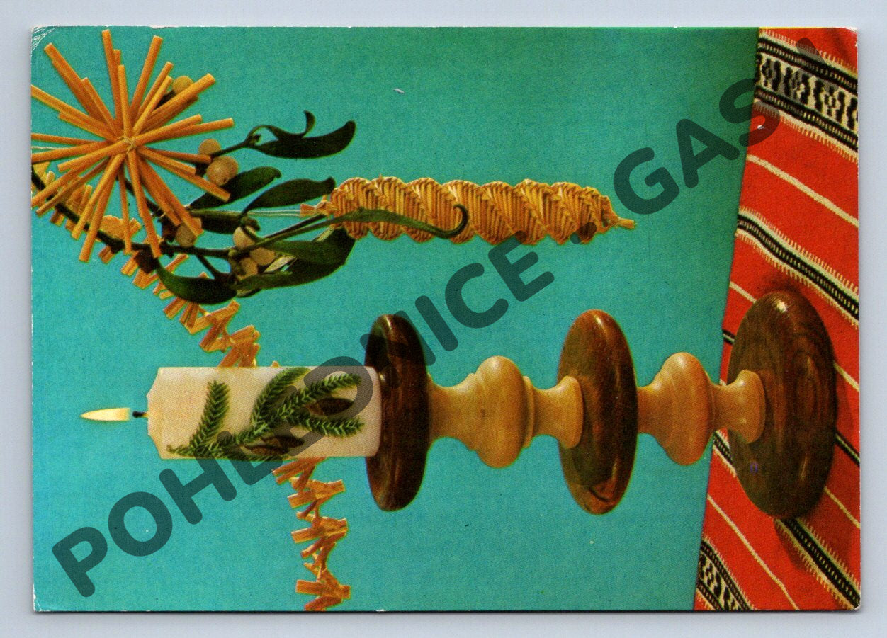 Originální československá pohlednice s motivem tradičních Vánoc. Na přední straně pohlednice je vyobrazena svíčka s výzdobou ze zelených větviček, slaměná ozdoba a barevná tkanina, což evokuje klasickou českou vánoční atmosféru. Pohlednice byla zaslána poštou, opatřena známkou ČSSR o hodnotě 30 haléřů a obsahuje ručně psané vánoční přání. Vydání Nakladatelství Svépomoc - Praha. Ideální sběratelský kousek pro milovníky starých vánočních motivů a pohlednic z období první poloviny 20. století. Dobový stav, známky stáří a oběhu.