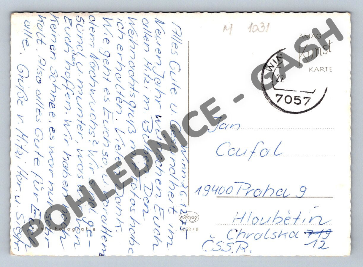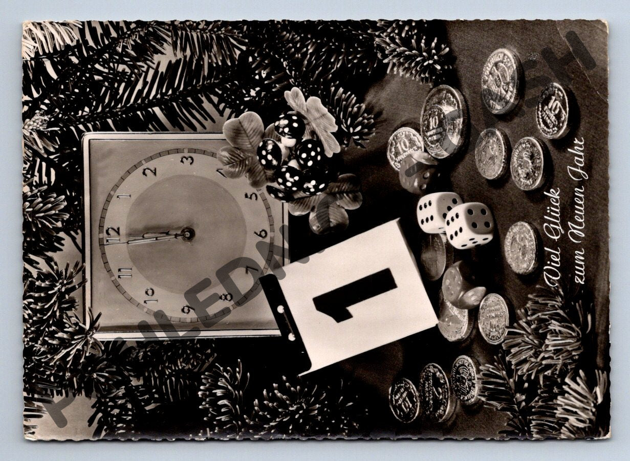 Originální černobílá pohlednice s novoročním motivem, kde je vyobrazen budík ukazující půlnoc, čtyřlístek, kostky a mince, což jsou tradiční symboly štěstí. Text Viel Glück zum Neuen Jahr (Mnoho štěstí do nového roku) je uveden přímo na pohlednici. Pohlednice byla skutečně odeslaná z Rakouska do Prahy (ČSSR), opatřená ručně psaným textem a poštovním razítkem z Vídně, datovaná 27. 12. Pěkný sběratelský stav, atraktivní tématika pro sběratele pohlednic i zájemce o novoroční motivy. Malý formát, známky stáří mírné opotřebení rohů.