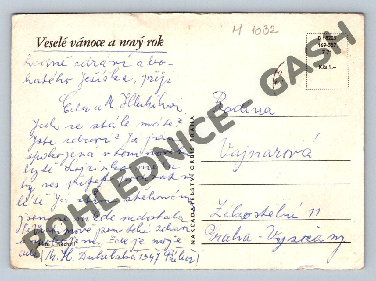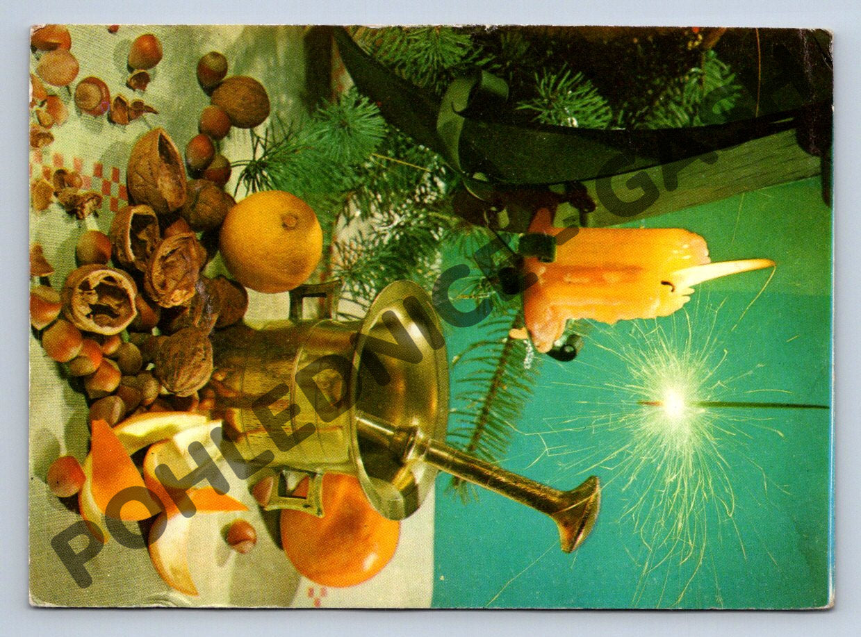 Nabízím originální českou pohlednici s vánoční tematikou. Na přední straně je barevná fotografie s kompozicí vlašských ořechů, lískových oříšků, pomerančů, zvonku, svíčky, prskavky a jehličnatých větviček. Pohlednice byla zaslána poštou a obsahuje ručně psaný vánoční pozdrav a adresu. Text na zadní straně začíná přáním Veselé vánoce a nový rok a nese známky běžného opotřebení. Jedná se o sběratelsky zajímavý kus z období Československa, vydaný nakladatelstvím Orbis Praha. Pohlednice je v dobrém stavu, vhodná pro sběratele historických pohlednic nebo jako retro dekorace.