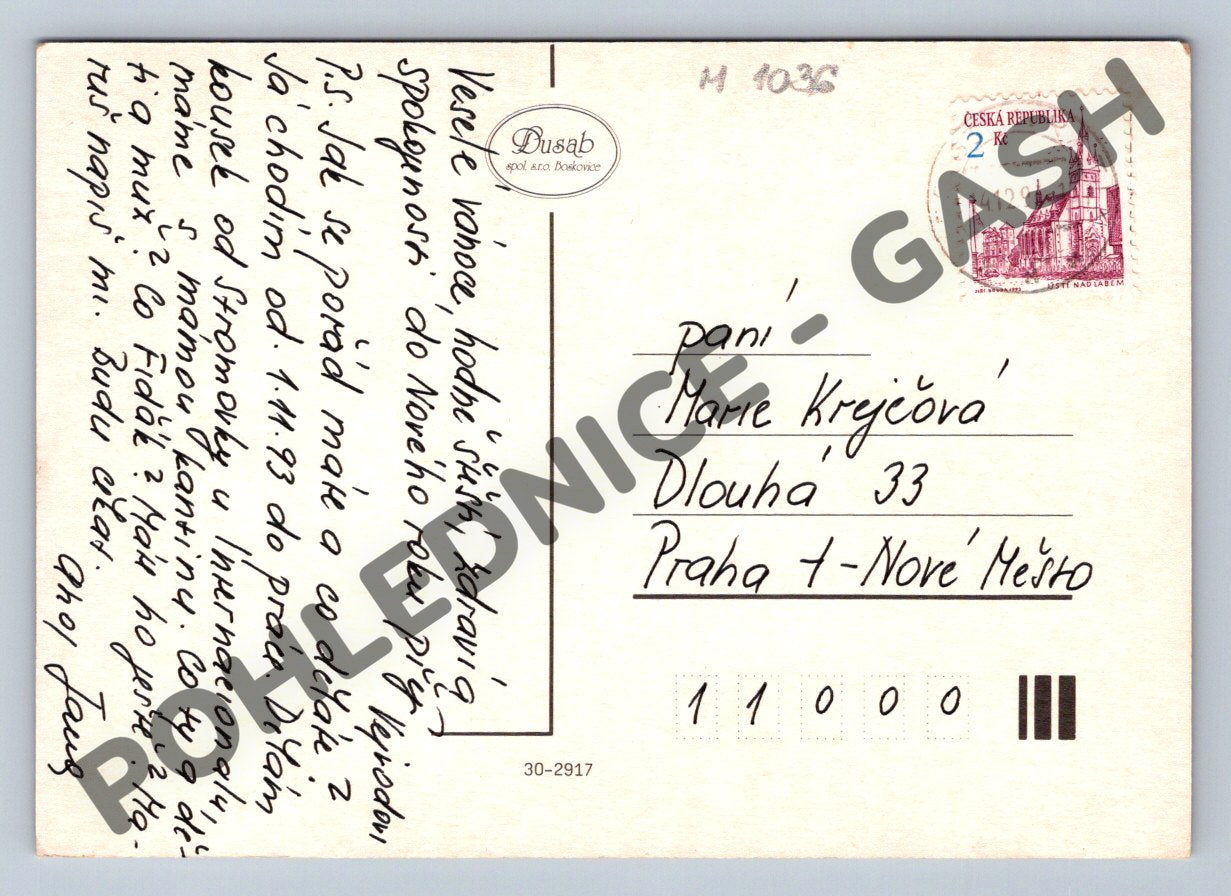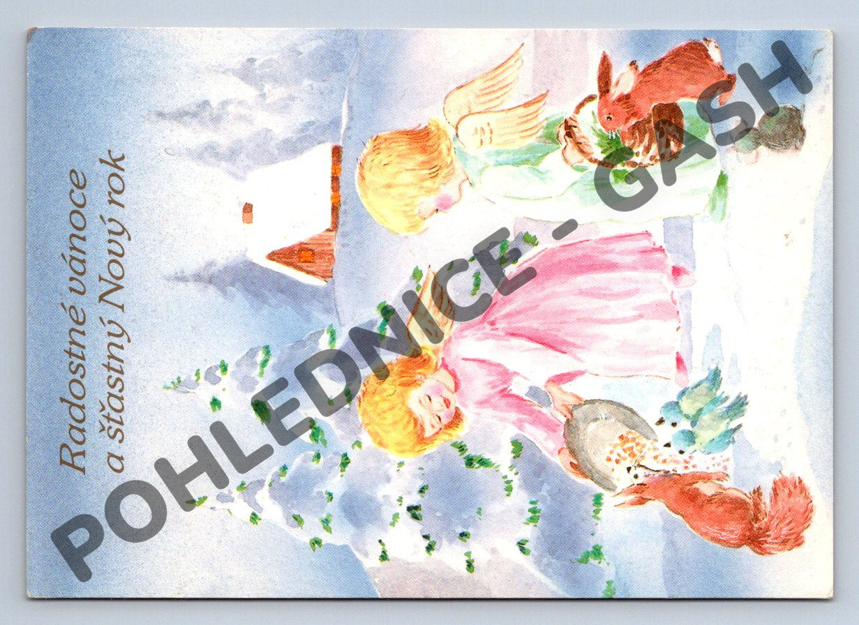 Vánoční pohlednice z České republiky, zaslaná poštou a opatřená známkou. Pohlednice má moderní malovaný motiv andílků a zvířátek v zasněžené krajině u chaloupky. Na přední straně je přání Radostné Vánoce a šťastný Nový rok. Pohlednice byla odeslaná po roce 1950, je ve velmi dobrém stavu, pouze mírné známky oběhu. Lze využít i jako sběratelský kousek nebo dekoraci. Zadní strana obsahuje ručně psanou vánoční zprávu a adresu příjemce v Praze.