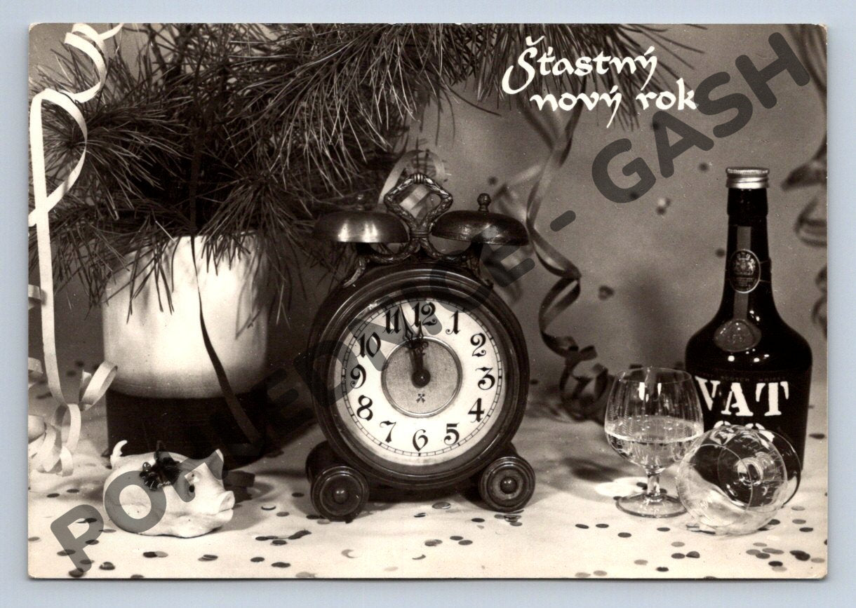 Originální černobílá novoroční pohlednice s přáním Šťastný nový rok. Na pohlednici je stylizované zátiší s retro budíkem, láhví alkoholu, skleničkami, skleněným prasátkem a novoroční výzdobou včetně větvičky borovice a stuh. Pohlednice byla odeslána, včetně ručně psaného textu a adresy, s poštovní známkou a razítkem. Fotografie J. Větroň, vydavatelství Orbis Praha. Ideální sběratelský kousek pro milovníky historických novoročních pohlednic z bývalého Československa. Dobrý stav, nepatrné opotřebení odpovídající stáří. Velmi pěkný sběratelský stav.
