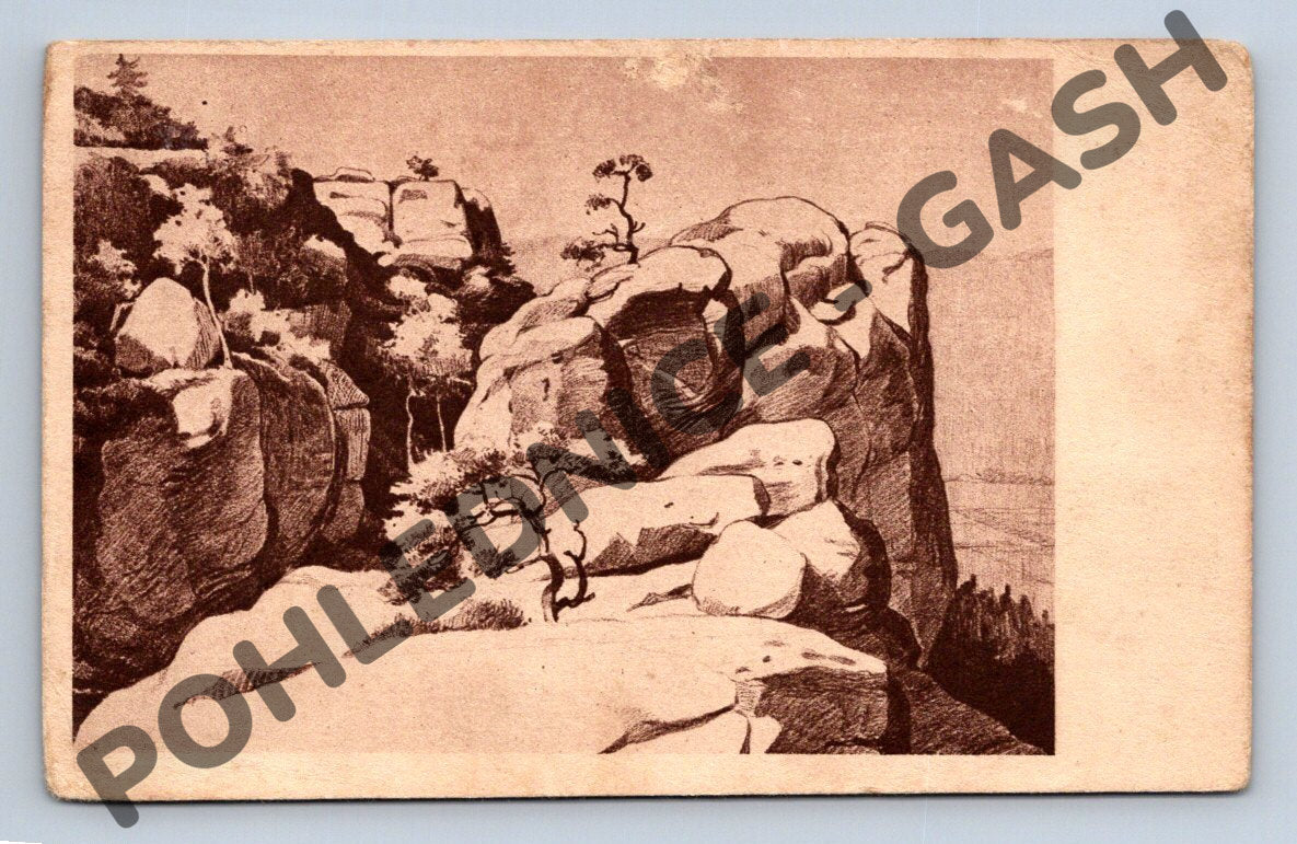 Starší pohlednice od autora K. Brousek s názvem Hrada, zobrazující skály z Velké vyhlídky pod ochozem. Umělecká kresba zachycuje malebnou krajinu s mohutnými skalními útvary a řídkými stromy v typickém českém prostředí. Na rubu pohlednice je uveden vydavatel: Nákladem odb. K. Čsl. T. v Mnich. Hradišti a tisk V. Neubert a synové, Smíchov. Pohlednice je v zachovalém stavu s lehkou patinou stáří, vhodná pro sběratele pohlednic s motivy skal, vyhlídek a přírodních scenérií.
