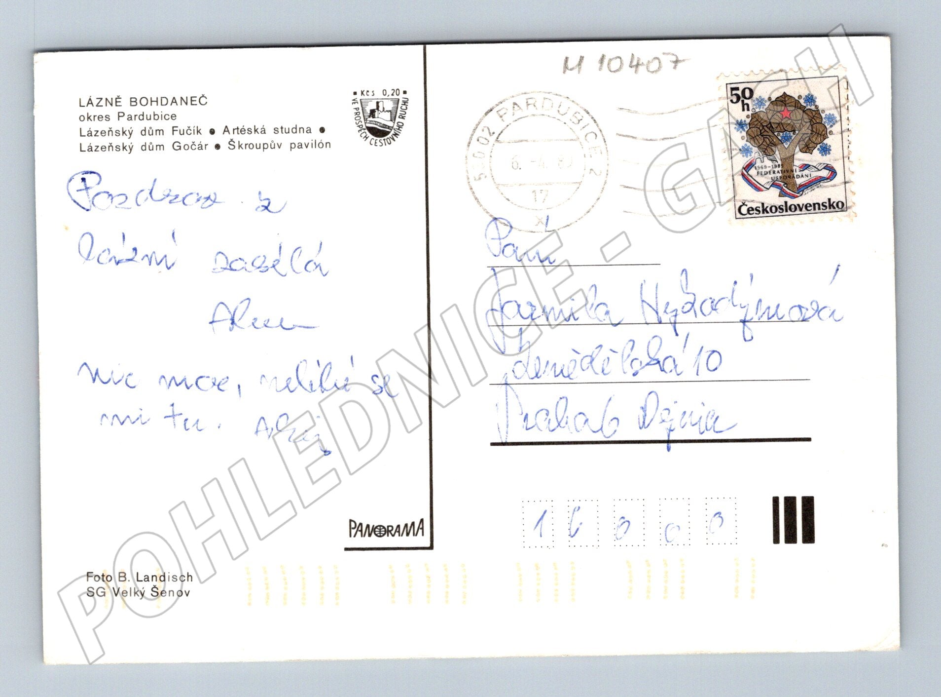 Originální pohlednice z lázeňského města Bohdaneč. Pohlednice zachycuje různé pohledy na lázeňské domy a areál, včetně fontán, soch a udržovaných parků. Na zadní straně je ručně psaný pozdrav, známka z období Československa a razítko z roku 1972. Pohlednice byla odeslána do Děčína. Výborný sběratelský kus pro milovníky historických pohlednic i lázeňství. Dobrá zachovalost a pěkná barevná fotografie. Fotograf: B. Landisch, vydavatel: SG Velký Šenov, vydáno pod značkou Panorama.