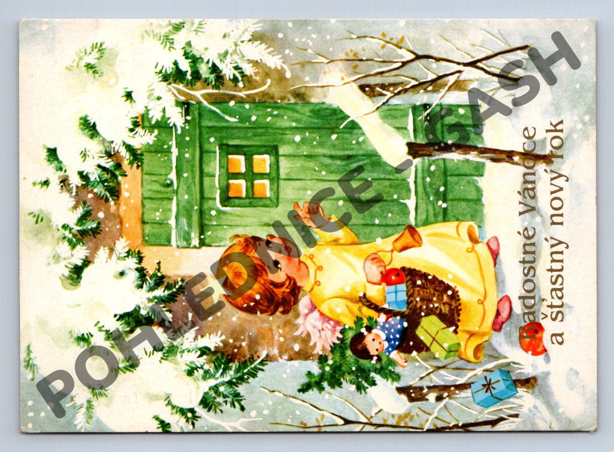 Nabízím starší českou pohlednici formátu většího rozměru s krásným vánočním motivem. Na přední straně je barevná ilustrace dítěte se zvířátkem (beránkem) a vánočními dárky před zasněženou chalupou se zelenými dveřmi. Pohlednice nese nápis Radostné Vánoce a šťastný nový rok. Druhá strana je popsaná, frankovaná známkou s motivem České republiky (nom. 3,60 Kč), razítkovaná. Odesláno do Nymburka. Celkově v pěkném, sběratelském stavu, běžné stopy stáří a manipulace. Vhodné do sbírky vánočních, českých nebo ilustrovaných pohlednic.