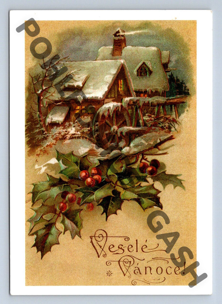 Vánoční pohlednice z České republiky, velký formát. Na přední straně je krásná barevná ilustrace zasněženého venkovského domu s vánočními motivy a větvičkami cesmíny s červenými bobulemi. Nápis Veselé Vánoce! v ozdobném písmu podtrhuje sváteční atmosféru. Zadní strana obsahuje vánoční přání a známku s portrétem Václava Havla, což dokresluje dobu odeslání pohlednice v období České republiky. Pohlednice je vytištěna tiskem EXPRINT, Červený Kostelec. Ideální k rozšíření sbírky pohlednic s vánoční tematikou nebo jako sběratelský kousek z období po roce 1950.