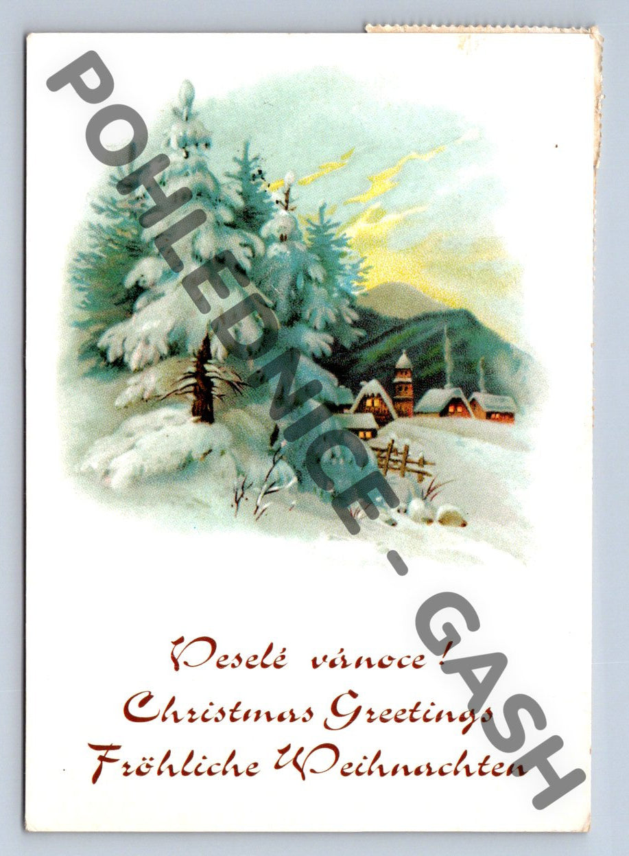 Nabízím originální vánoční pohlednici s motivem zimní krajiny a chalupy v lese. Na lícové straně je krásná ilustrace zasněžených stromů a chalupy, doplněná nápisy ve třech jazycích: Veselé Vánoce! / Christmas Greetings / Fröhliche Weihnachten. Pohlednice je ručně psaná, prošlá poštou a opatřená známkami České republiky a Československa. Datum razítka: 1985. Je ve velmi dobrém stavu, rohy lehce opotřebovány. Ideální pro sběratele historických pohlednic nebo jako krásná vánoční dekorace či dárek. Formát zhruba odpovídá malému formátu používanému před rokem 1950.