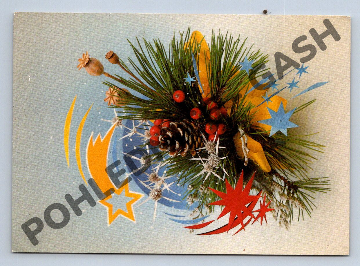 Vánoční pohlednice s motivem vánočního aranžmá ze smrkových větviček, šišky, červených bobulí a barevných hvězd na světlém pozadí. Na zadní straně je tištěné přání Radostné vánoční svátky a ručně psaný vzkaz s adresou. Pohlednice byla vydána vydavatelstvím Pressfoto, foto D. Ivanová, tisk Grafobal Skalica. Rozměry klasického malého formátu, vhodné pro sběratele historických československých pohlednic se sváteční tematikou.