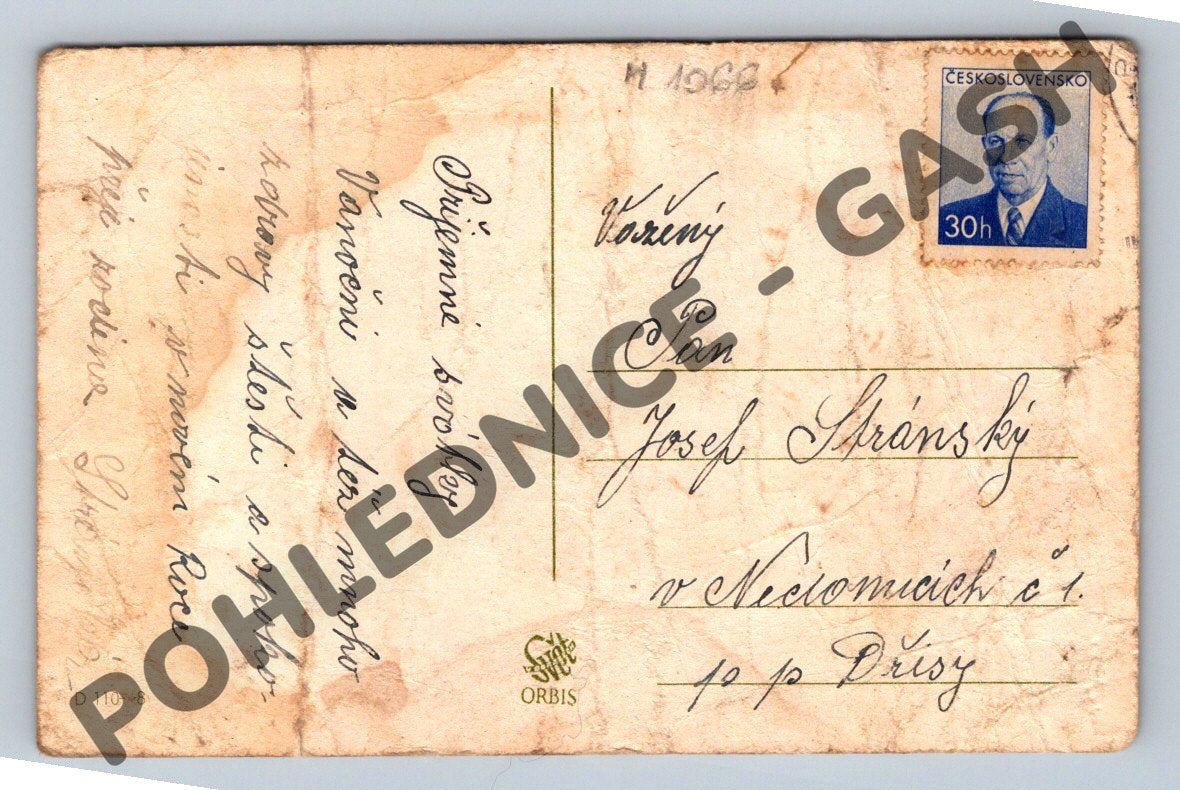 Starší, prošlá pohlednice s vánočním námětem – zasněžený les. Pohlednice obsahuje přání Příjemné vánoce a šťastný Nový rok a ručně psaný vzkaz. Na zadní straně je adresa a razítko, včetně známky Československo 30h s portrétem prezidenta. Stav pohlednice odpovídá věku – obě strany vykazují známky opotřebení, zažloutnutí a drobné ohyby, viz foto. Vhodné pro sběratele historické korespondence a pohlednic s českými motivy a vánoční tématikou.
