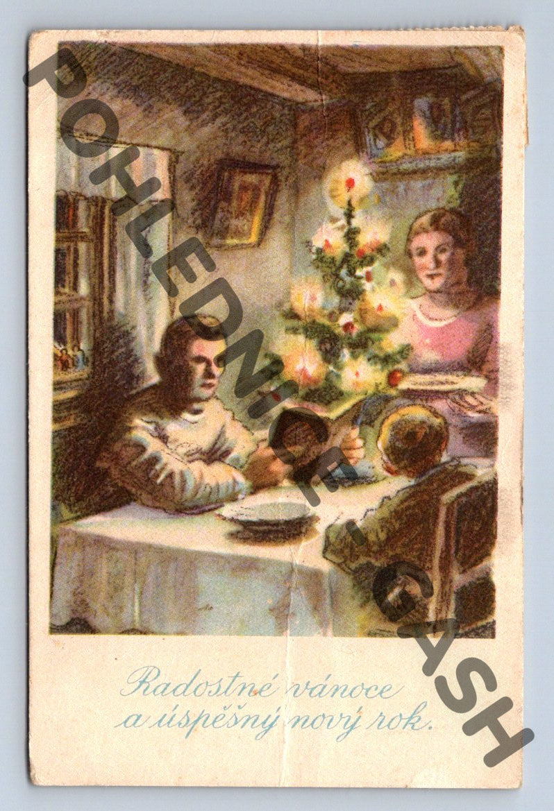 Originální vánoční pohlednice z Československa, odeslaná v roce 1951. Na přední straně je barevná kresba od C. Kotyšana zobrazující rodinu u vánočního stromečku s nápisem Radostné vánoce a úspěšný nový rok. Zadní strana obsahuje ručně psaný vzkaz a originální známku s portrétem prezidenta Klementa Gottwalda v hodnotě 1,50 Kčs. Pohlednice byla adresována paní Anně Česalové do obce Příkazy u Mirošova. Celkový stav odpovídá stáří, pohlednice je mírně opotřebovaná, s viditelným přehybem uprostřed. Skvělý sběratelský kus dokumentující vánoční atmosféru a poštovní historii poválečného Československa.
