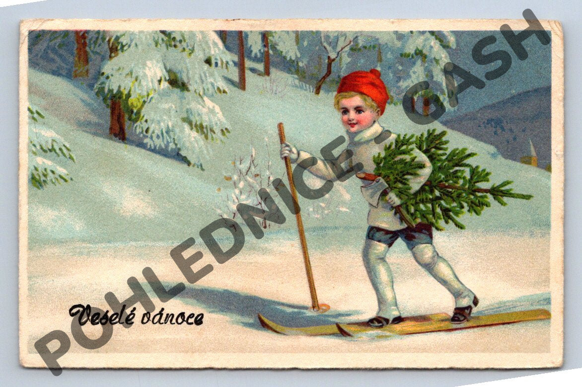 Nabízím originální starou vánoční pohlednici z období před rokem 1950. Na pohlednici je vyobrazen zimní motiv s dítětem na lyžích, které nese větvičku jehličnanu. Na přední straně je tištěný nápis Veselé vánoce. Zadní strana je vyplněná, opatřená poštovní známkou a razítkem s datem 27. 12. 1949. Pohlednice je adresovaná na pana Josefa Stránského a obsahuje klasické vánoční přání. Výborná ukázka historické korespondence a zimních motivů, vhodná do sbírky nebo jako dekorace. Celkový stav je velmi pěkný, viz foto.