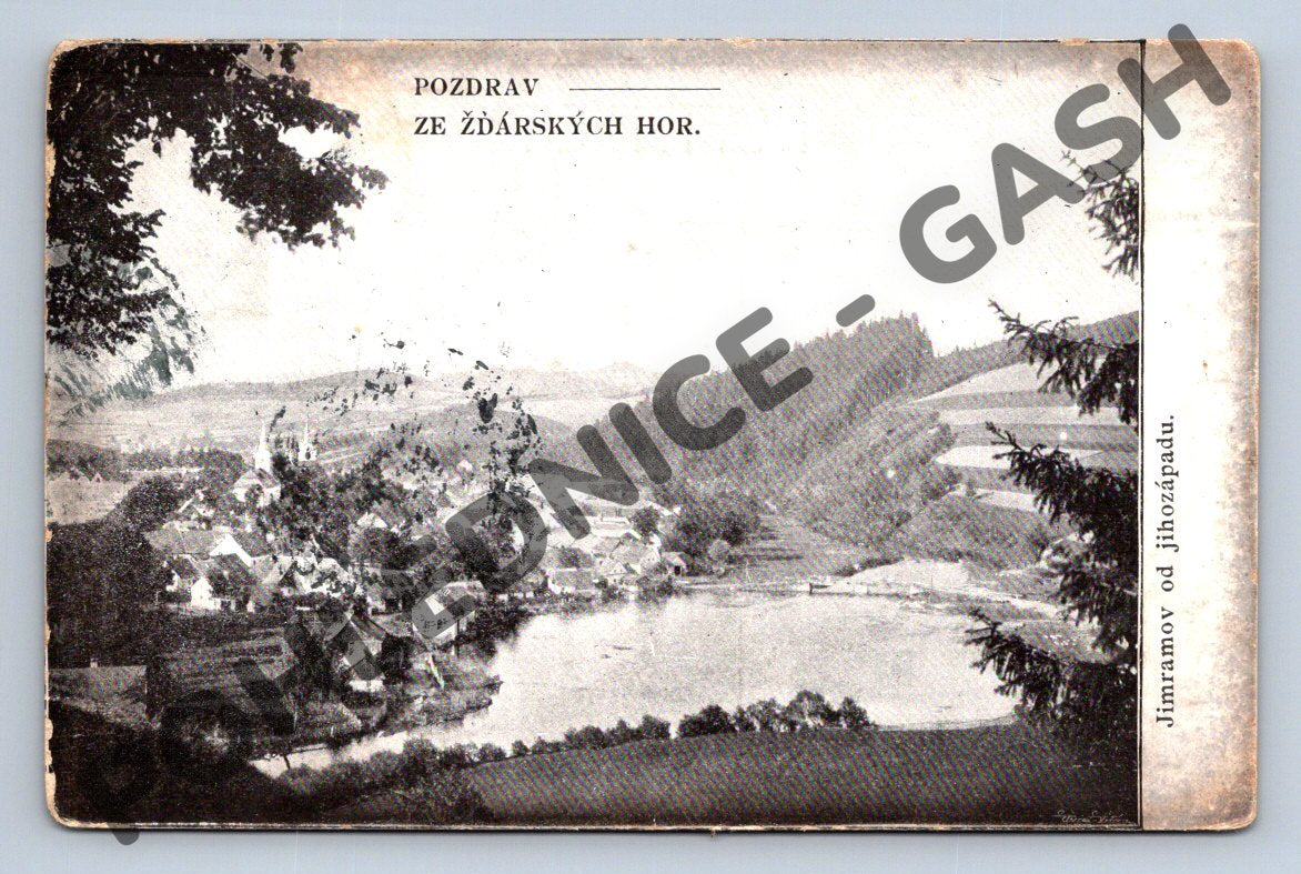 Starý černobílý pohled Pozdrav ze Žďárských hor s pohledem na město Jimramov od jihozápadu. Pohlednice byla zaslána, na zadní straně je ručně psaný text, adresa a známka s razítkem. Vydáno prospěšnému účelu v rámci Hovoru po českých horách. Pohlednice je v zachovalém stavu, lehce opotřebovaná odpovídající svému stáří. Jedná se o malý formát vydaný před rokem 1950, vhodný do sbírky historických pohlednic z českých regionů.