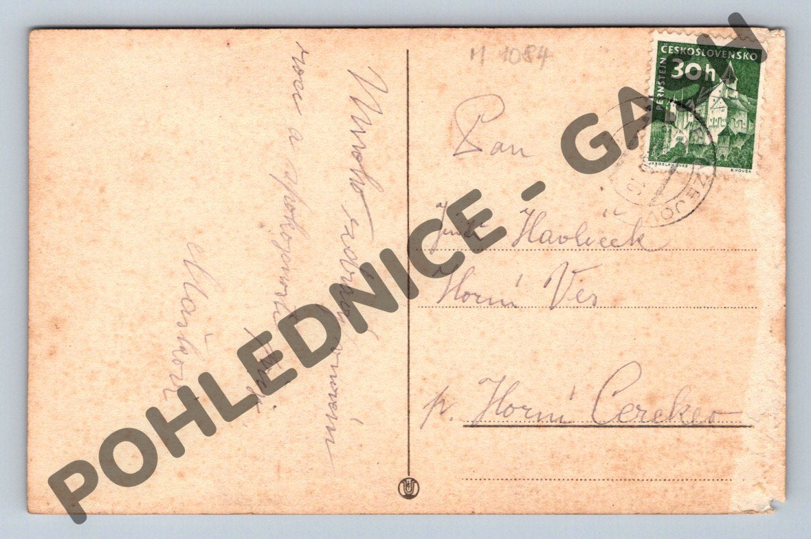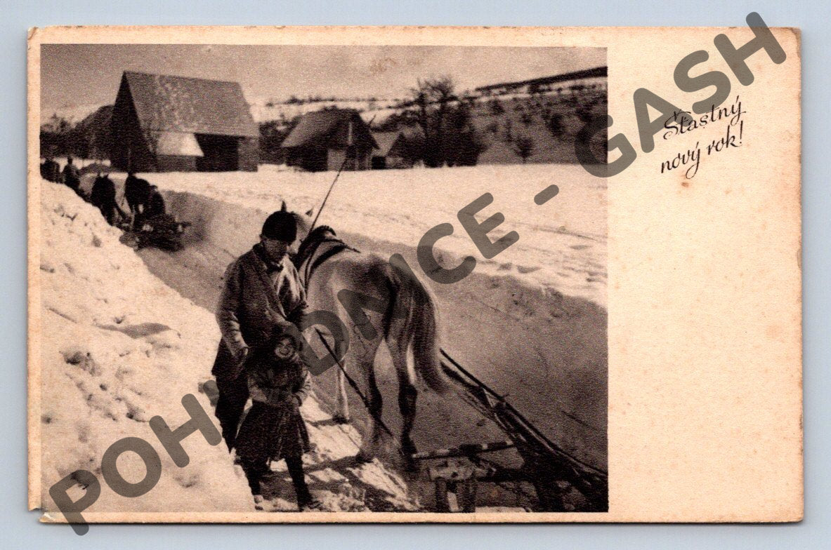 Starší pohlednice s novoročním přáním Šťastný nový rok! , odeslaná z Československa. Na přední straně je černobílá fotografie zimní vesnice, na které je zachycena scéna se zapřaženým koněm, který táhne sáňky po zasněžené cestě. Pohlednice ukazuje tradiční venkovský zimní život a přepravu v minulosti. Na zadní straně je známka a rukou psaný vzkaz adresovaný do Horní Cerekve. Stav odpovídá stáří pohlednice, jsou patrné známky opotřebení a skvrny. Skvělý sběratelský kousek pro milovníky historických a tématických pohlednic s motivem koní czy zimních krajin.