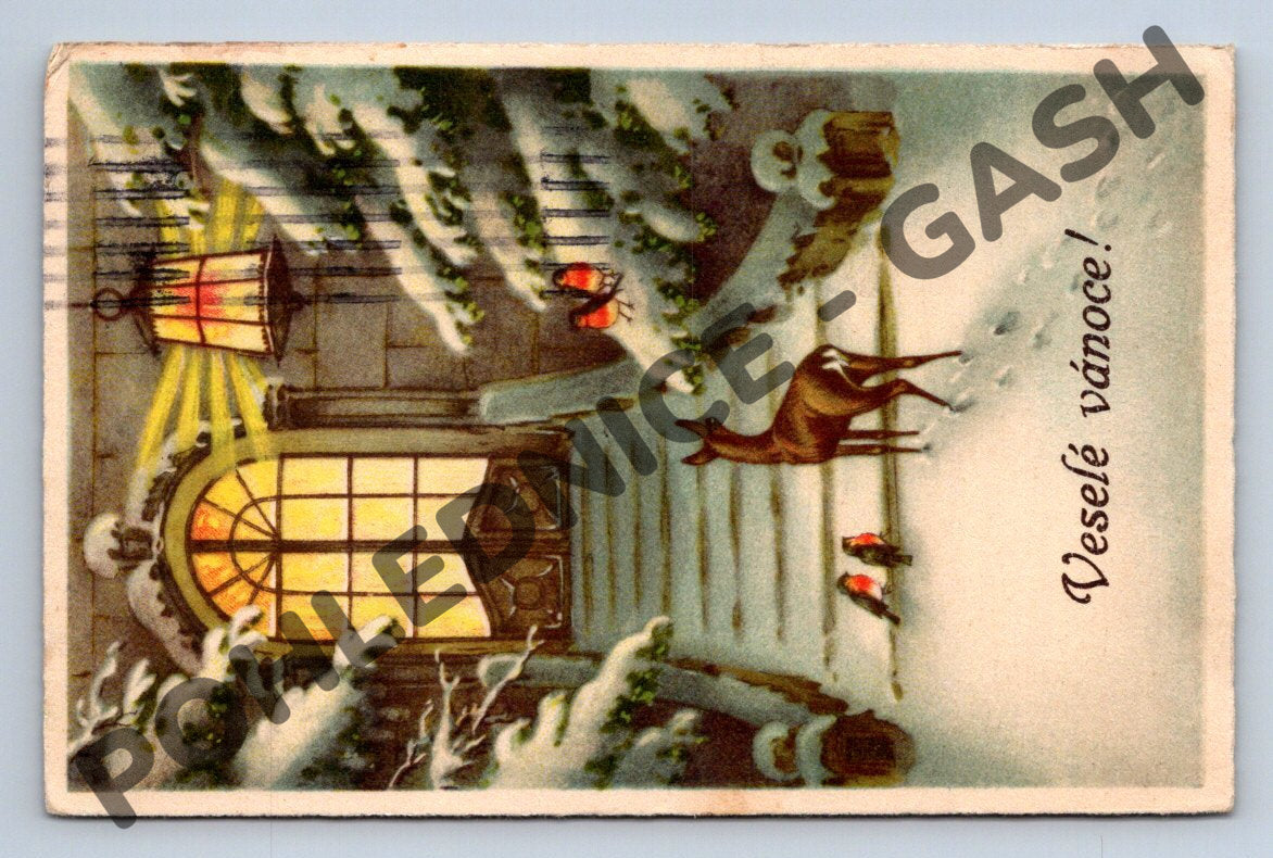 Originální vánoční pohlednice zaslaná z Brna v roce 1943 s krásným kolorovaným vánočním motivem. Na obrázku je zobrazen zasněžený vchod domu, srnka a ptáčci. Pohlednice je opatřená dobovou známkou Böhmen und Mähren a razítkem Brno 2 z 21. 12. 1943. Na zadní straně je ručně psaný vzkaz a adresa adresáta. Výborný stav, decentní patina, vhodné jako sběratelský kousek nebo jako dárek milovníkům historických pohlednic z období Protektorátu Čechy a Morava.