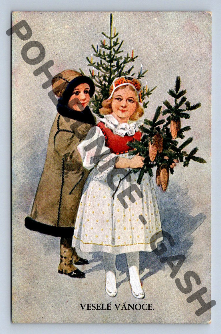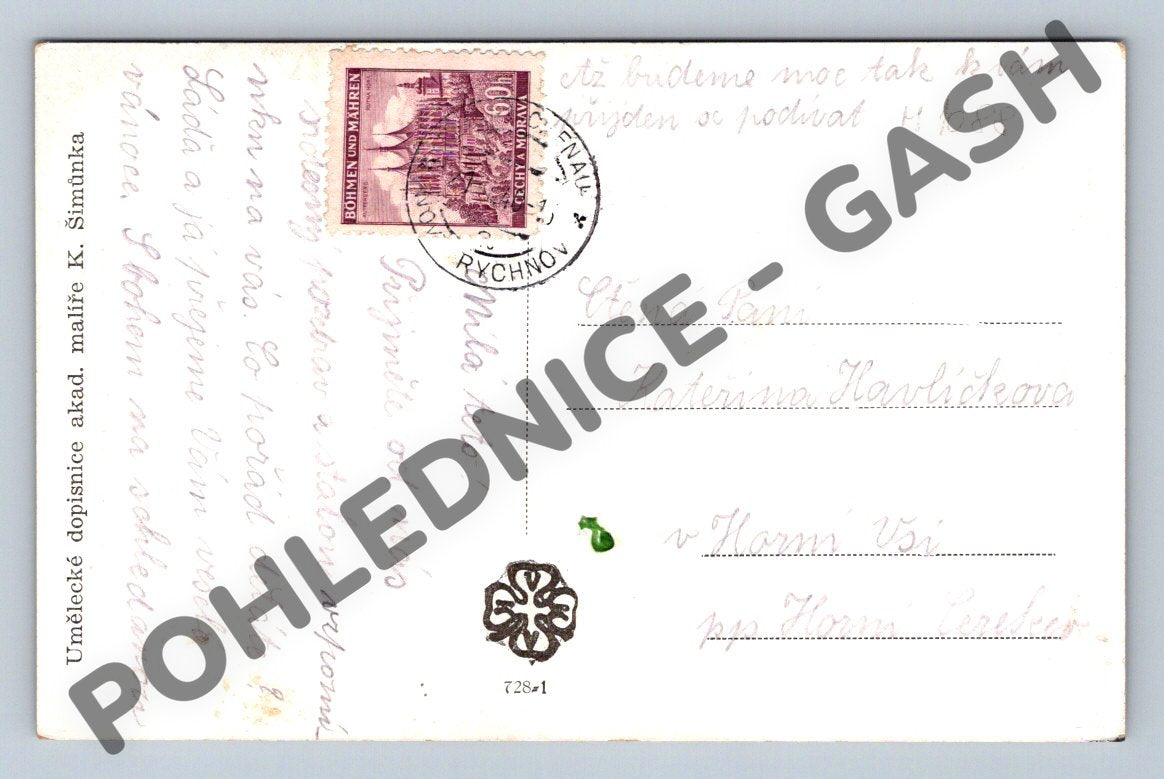 Starobylá česká vánoční pohlednice s motivem dvou dětí v krojích, nesoucích ozdobený vánoční stromek. Na přední straně je nápis Veselé Vánoce . Pohlednice je uměleckým dílem akademického malíře K. Šimůnka. Na zadní straně je ručně psaný text, adresa a postovní známka z období Protektorátu Čechy a Morava s razítkem Rychnov. Jedná se o originální historickou pohlednici z první poloviny 20. století, která potěší sběratele i milovníky vánočních motivů a české kultury. Pohlednice nese jasné známky stáří a užití, je však ve sběratelském stavu, vhodná do každé kolekce.