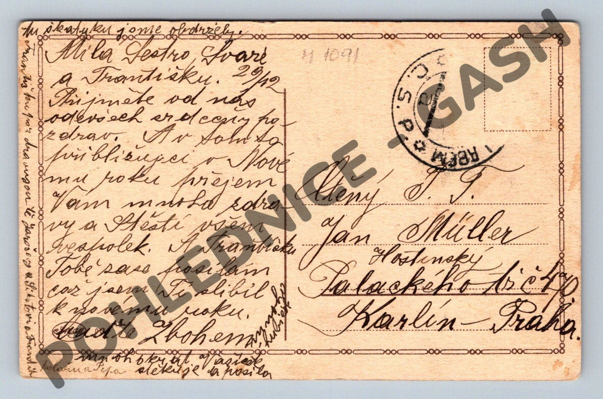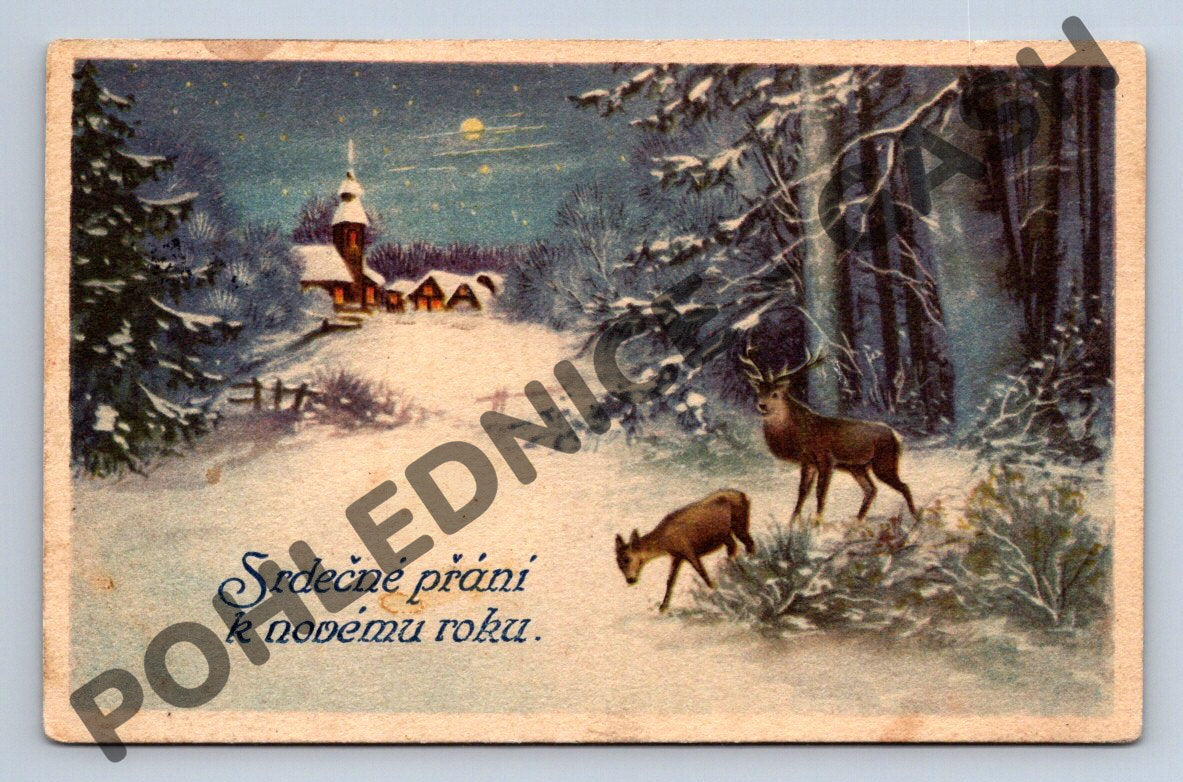 Starší pohlednice s novoročním motivem, pravděpodobně z období první poloviny 20. století. Na pohlednici je vyobrazena zasněžená krajina, les s jeleny v popředí a v pozadí vesnice s kostelem pod noční zimní oblohou. Na přední straně je text Srdečné přání k novému roku. Zadní strana obsahuje ručně psaný text a poštovní razítko. Pohlednice nese známky stáří (mírné opotřebení, zažloutnutí papíru). Velmi pěkný sběratelský kousek vhodný pro milovníky historických pohlednic a vánočních nebo novoročních motivů.