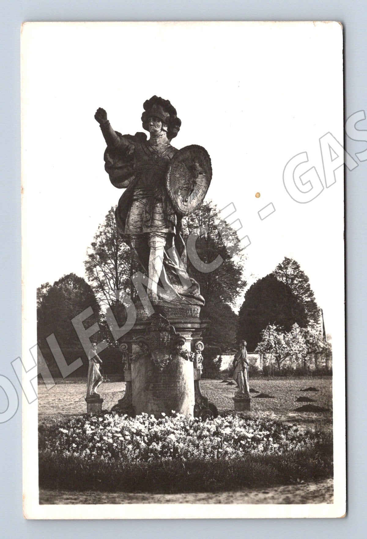 Pohlednice Kuks – Velký Boží bojovník, barokní socha, 1949, zaslaná