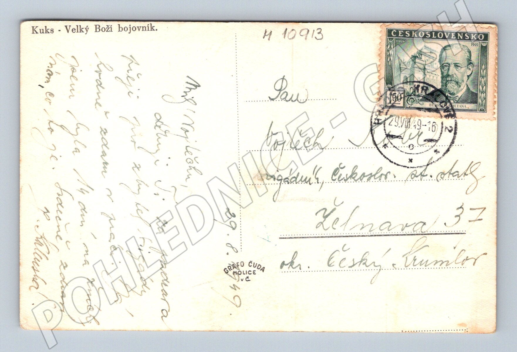Starší černobílá pohlednice s motivem sochařské výzdoby v areálu zámku Kuks – Velký Boží bojovník. Na přední straně je vyobrazena výrazná barokní socha v rozkvetlé zahradě, v pozadí parkové cesty. Na zadní straně naleznete rukopisný text, poštovní známku z období Československa a razítko s datací 1949. Pohlednice je velmi dobře zachovalá vzhledem ke svému stáří, rohy mírně opotřebované. Výjimečný sběratelský kousek s atraktivním barokním motivem, vhodný do sbírky historických pohlednic nebo pro milovníka Kuksu a barokního umění.