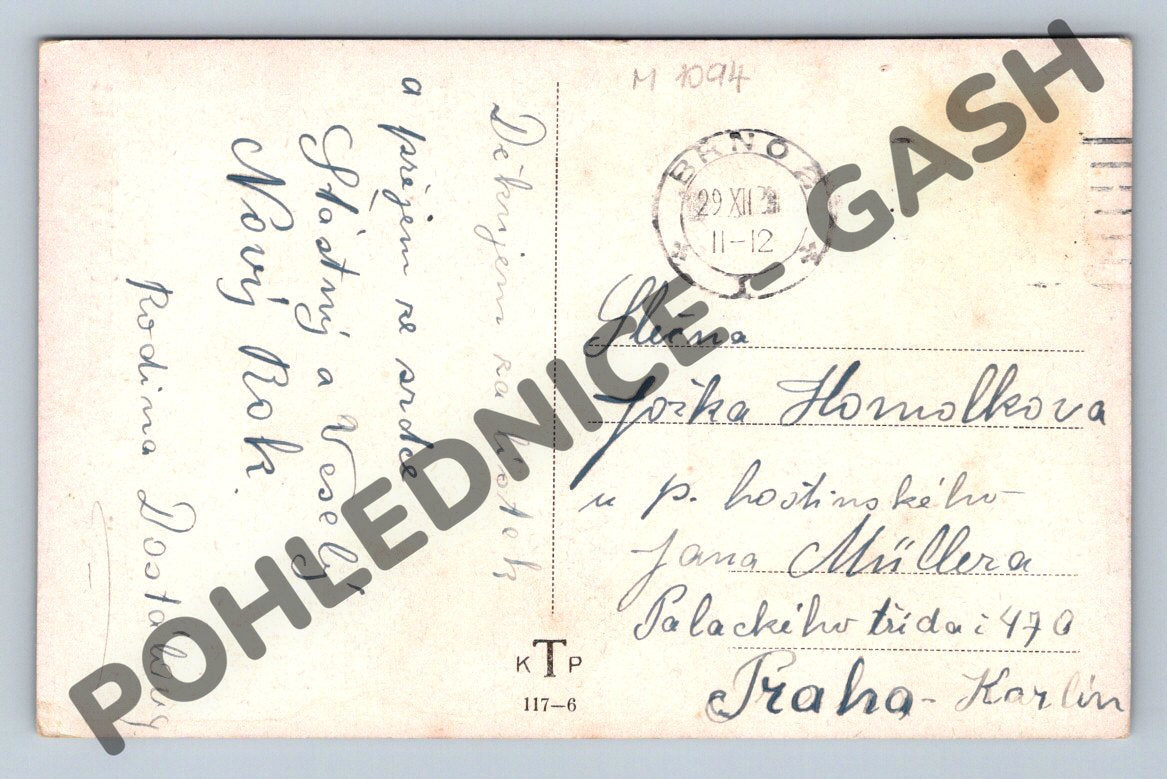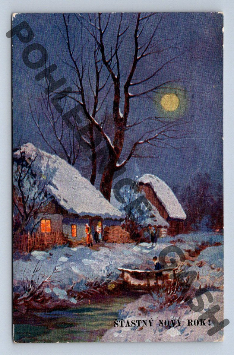 Starší pohlednice s novoročním motivem z období první poloviny 20. století. Na přední straně je umělecká zimní krajina s měsíční nocí, zasněženými chalupami a stromy, vpravo je nápis ŠŤASTNÝ NOVÝ ROK. Zadní strana obsahuje rukopisné věnování, poštovní razítko Brno z 29. 12. (rok není zcela čitelný, ale odpovídá stylu cca 1920-1930) a adresu adresátky v Praze. Pohlednice je klasického menšího formátu a má již drobné známky stáří a použití. Ideální pro sběratele historických pohlednic s českou tematikou a autentickou poštovní historií.