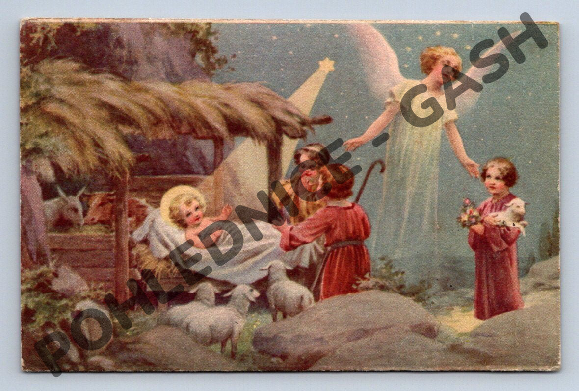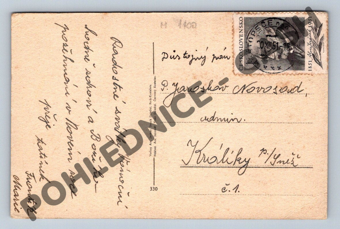 Nabízím originální vánoční pohlednici z období Československa, odeslanou v roce 1951. Na přední straně je krásně ilustrovaný motiv narození Ježíška v Betlémě s andělem a dětmi obklopenými ovečkami v přírodě. Pohlednice je opatřena dobovou známkou a razítkem, na zadní straně je ručně psaný vzkaz. Celkový stav pohlednice odpovídá stáří – mírné opotřebení odpovídající věku, barvy stále živé. Skvělý přírůstek do sbírky historických svátečních pohlednic.