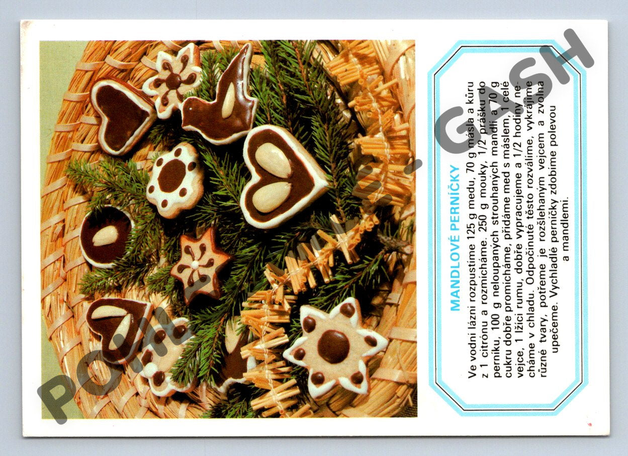 Originální pohlednice z bývalého Československa s motivem mandlových perníčků. Na přední straně je barevná fotografie vánočního cukroví – perníčků různých tvarů (srdíčka, hvězdy, holubičky atd.) ozdobených polevou a mandlemi, naaranžovaných na proutěném podnosu se zelenými větvičkami. Nechybí zde ani podrobný recept na výrobu mandlových perníčků. Zadní strana je čistá, určená k odeslání, s tiskem Vydavatelství Pressfoto Praha, Severografia Děčín. Ideální sběratelský kousek pro milovníky tradičních pohlednic, gastronomie a retro stylu. Stav velmi dobrý, bez popsání.