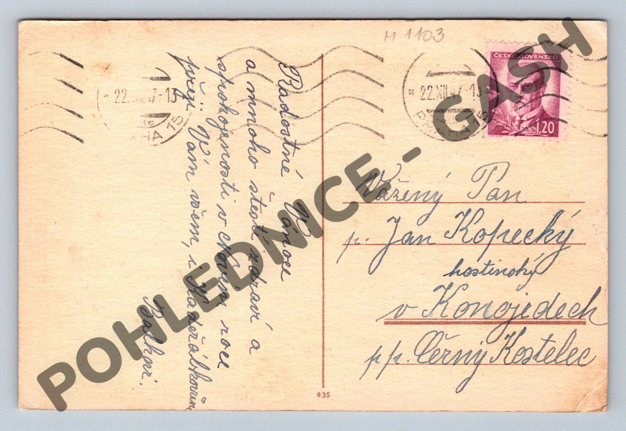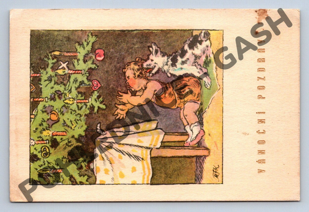 Originální pohlednice z období Československa, na které je vyobrazena veselá vánoční scéna s dítětem a kočkou u vánočního stromečku. Pohlednice je zaslána s poštovním razítkem z roku 1947 a originální známkou o hodnotě 1,20 Kčs. Na zadní straně je rukou psaný osobní vzkaz adresovaný panu Janu Kopeckému do Konojed. Krásné barevné ilustrace a motiv kočky dělají z této pohlednice sběratelsky zajímavý kousek, vhodný zejména pro milovníky koček a historických vánočních pohledů. Stav pohlednice je odpovídající stáří, viz foto.