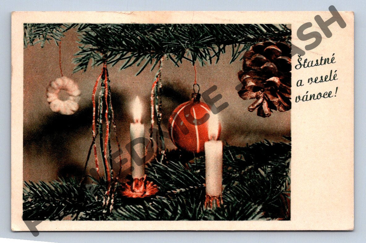 Originální česká vánoční pohlednice z roku 1947 s přáním Šťastné a veselé vánoce!. Na přední straně motiv tradičních vánočních ozdob na smrkové větvi, dvě zapálené svíčky, baňka, cukroví a šiška. Zadní strana obsahuje ručně psané věnování, známky poštovního oběhu a poštovní razítko z roku 1947. Pohlednice je ve velmi dobrém sběratelském stavu, s mírnými stopami stáří. Skvělý doplněk do sbírky historických vánočních pohlednic nebo jako dárek milovníkům retro vánočních dekorací.