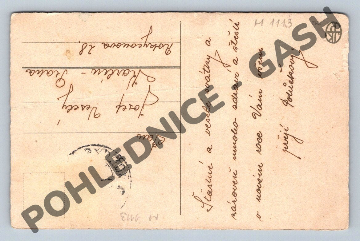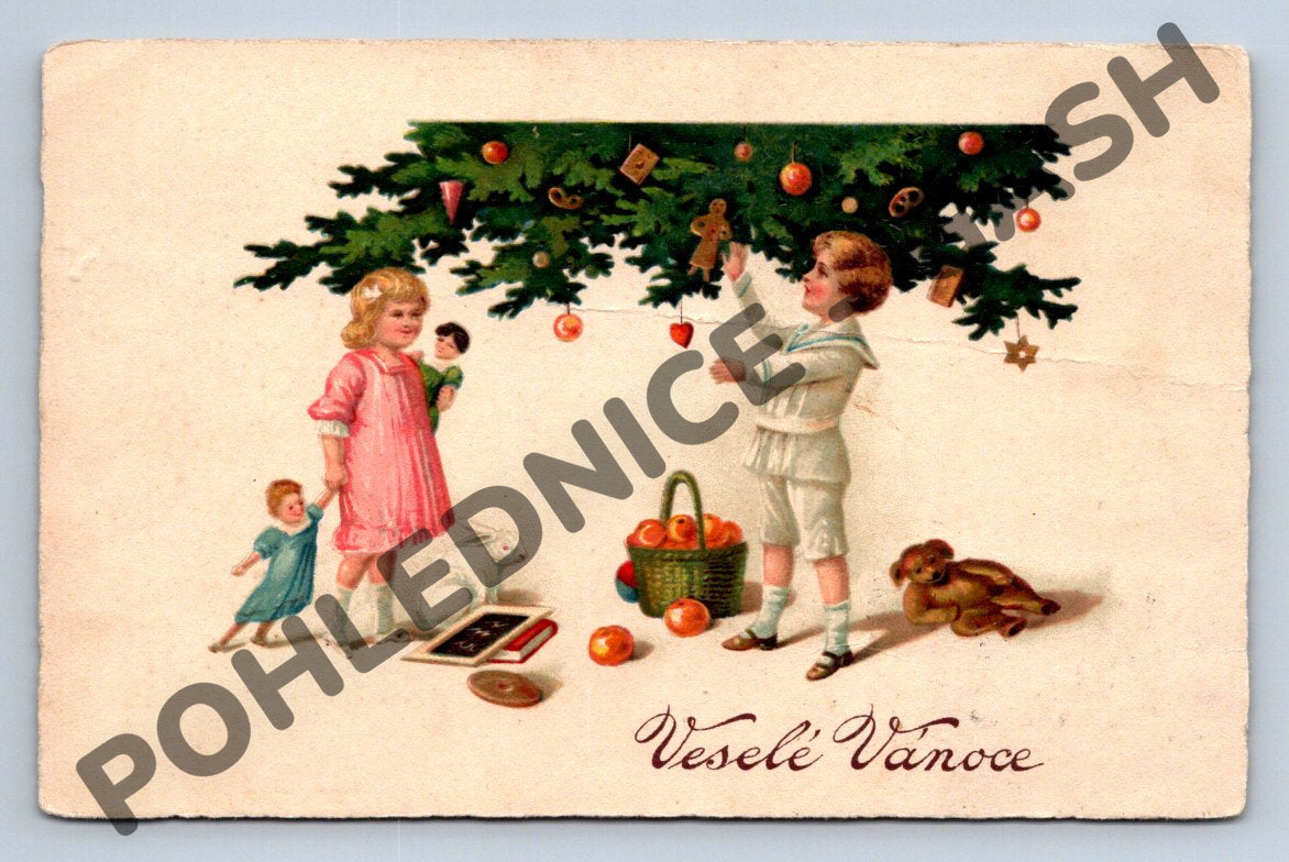 Originální stará pohlednice s českým vánočním motivem z období před rokem 1950. Na lícní straně je krásná ilustrace dětí u ozdobeného vánočního stromku s dárky, starými hračkami a nápisem Veselé Vánoce . Na rubu je ručně psané vánoční přání a adresa. Pohlednice nese známky stáří, jako jsou drobné ohyby a opotřebení rohů, což podtrhuje její dobový charakter a sběratelskou hodnotu. Ideální přírůstek do vaší sbírky historických pohlednic, nebo jako unikátní dárek s retro atmosférou.