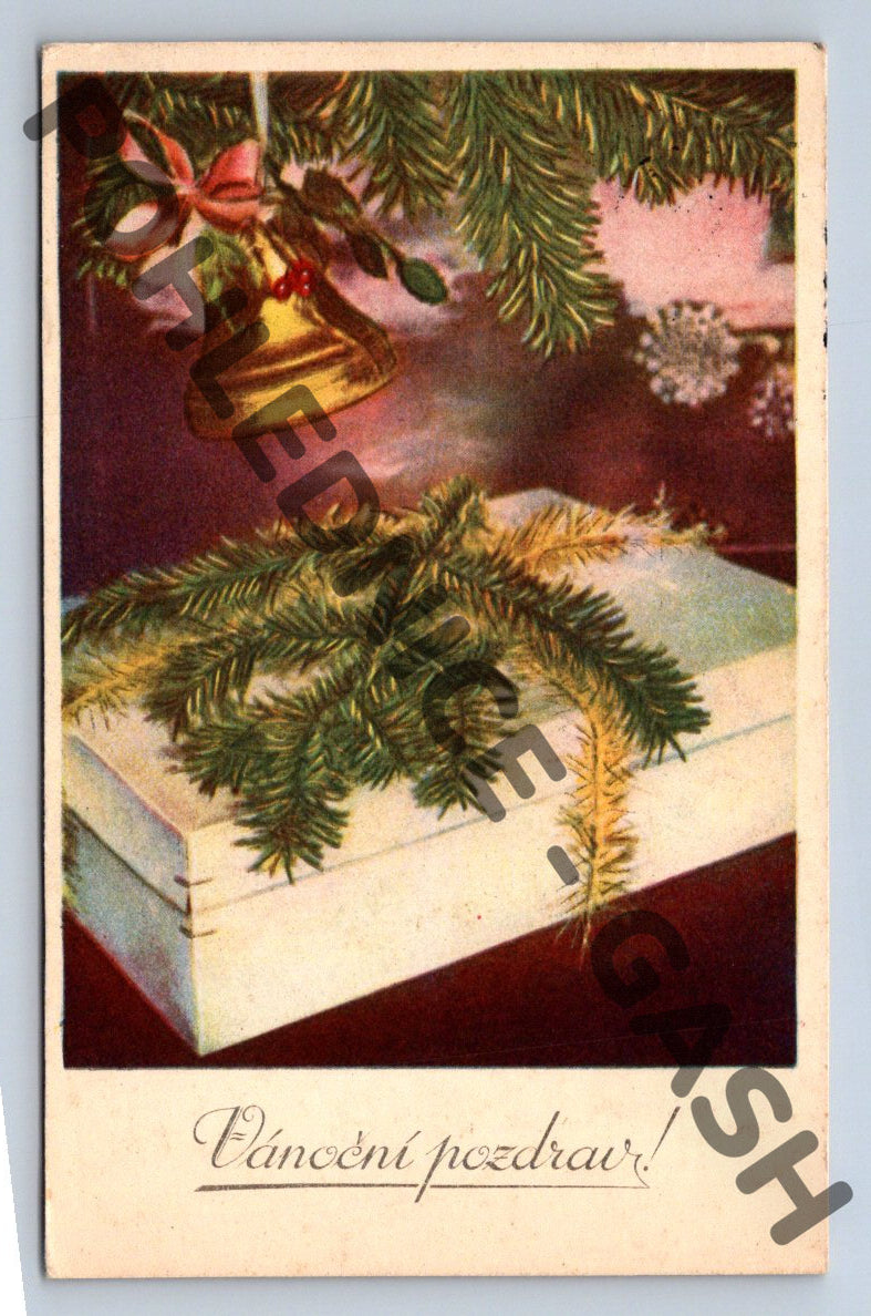 Vánoční pohlednice ČSR – do 1950, motiv zvonek a větvička