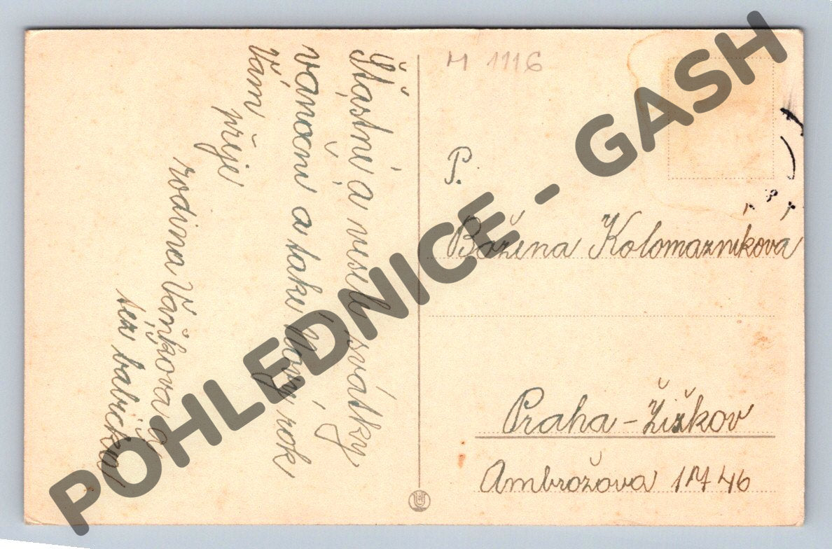 Starší vánoční pohlednice malého formátu s vyobrazením vánočního motivu – zvonek, větvička smrku, baňky a vločky. Na přední straně je nápis Vánoční pozdrav. Zadní strana obsahuje ručně psaný vzkaz a adresu, odesláno do Prahy-Žižkova. Pohlednice je zachovalá, vhodná jako sběratelský kousek nebo dekorace pro období Vánoc. Krásný historický doklad české pohlednicové tradice před rokem 1950.
