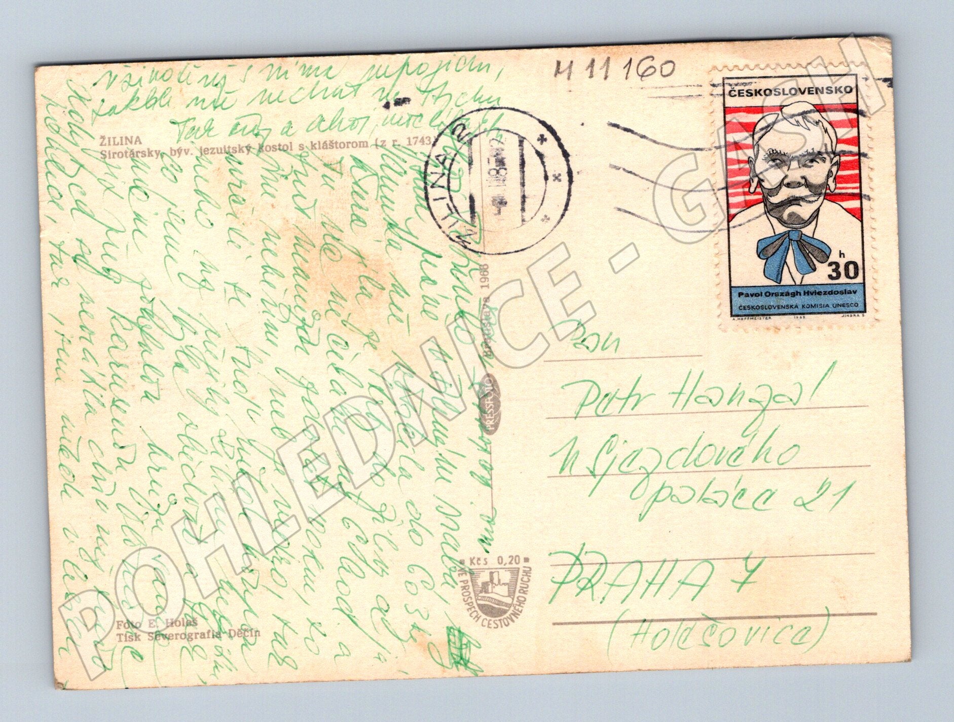 Originální pohlednice s vyobrazením historického centra města Žilina na Slovensku. Na přední straně je detailní pohled na náměstí s kostelem, květinovou zahradou a okolní zástavbou, v pozadí jsou vidět kopce slovenské krajiny. Zadní strana obsahuje známku s vyobrazením Pavola Országha Hviezdoslava a rukopisný text s datem 1960. Pohlednice skvěle zachycuje dobovou atmosféru slovenského města a je vhodná pro sběratele historických pohlednic, zájemce o historii Slovenska či zájemce o korespondenci minulého století. Originální stav, známky opotřebení odpovídají stáří a cestě pohlednice poštou.