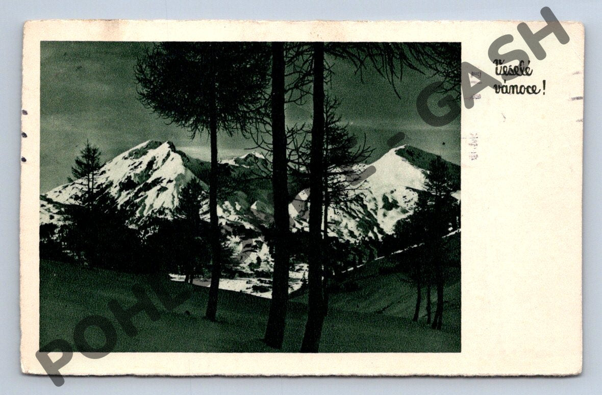 Originální stará pohlednice s černobílým zimním motivem horské krajiny s pozdravem Veselé Vánoce!. Na zadní straně je ručně psaný text, vánoční přání a známka z období Protektorátu Čechy a Morava (hodnota 50h). Pohlednice je adresována na hotel Opera, Praha. Datum odeslání dle razítka je z roku 1942. Celkový stav je velmi dobrý, mírné opotřebení odpovídající stáří pohlednice. Vhodné do sbírky historických pohlednic nebo jako dárek pro sběratele.