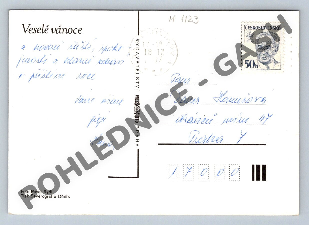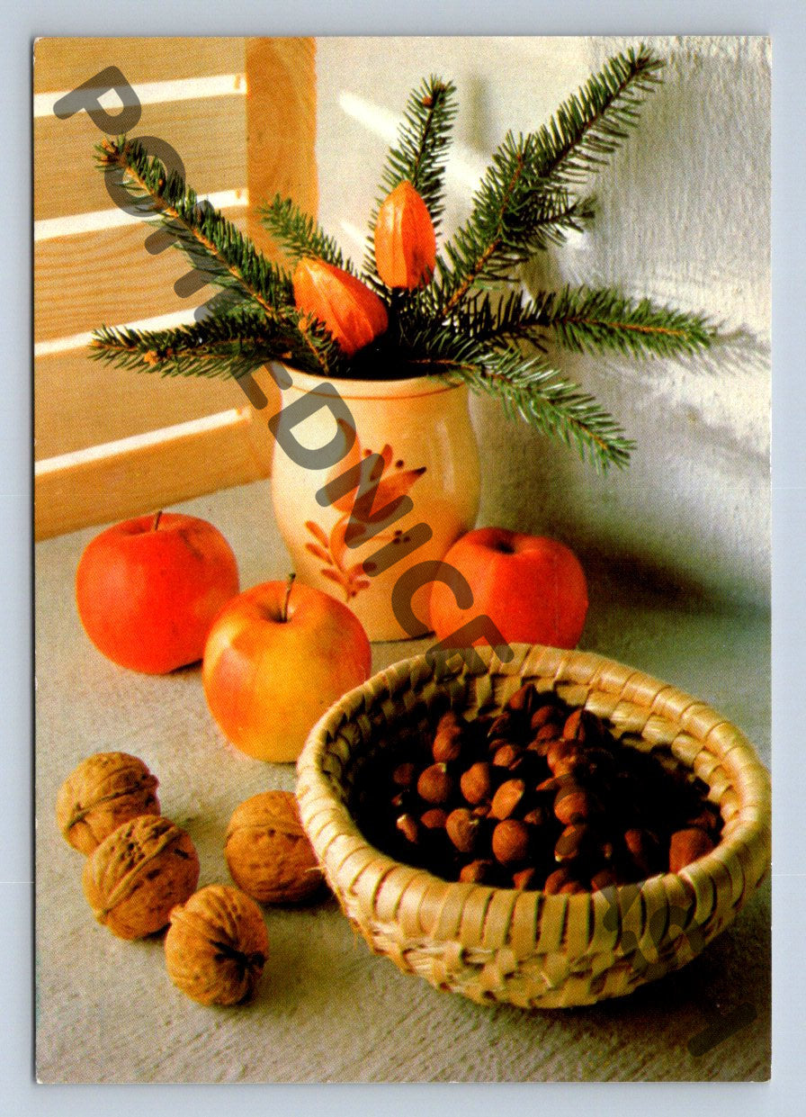 Vánoční pohlednice z bývalého Československa s motivem vánoční dekorace – větvička jehličnanu, ovoce (jablka), ořechy a košíček s lískovými ořechy. Na zadní straně je přání Veselé vánoce a ručně psaný vzkaz. Pohlednice byla odeslaná, nese známku a poštovní razítko z období Československa. Vhodné pro sběratele historických pohlednic i milovníky vánoční atmosféry. Formát klasický menší (před rokem 1950), tisk Severografia Děčín, foto Pavel Rydl.