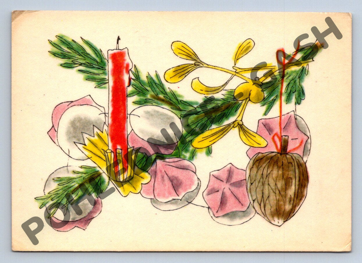 Krátce poštovně prošlá československá vánoční pohlednice s kolorovanou kresbou od V. Vrbové. Na přední straně je krásná vánoční dekorace se svící, větvičkami jehličnanu, jmelím a vlašským ořechem. Na zadní straně ručně psané vánoční a novoroční přání, razítko Praha 25 s datem 21. 12. 1961 a dobová známka s mapou Evropy. Pohlednice je zachovalá, s drobnými známkami opotřebení odpovídajícími stáří, bez vážnějších poškození. Formát pohlednice odpovídá malému formátu používanému v poválečném období. Skvělý sběratelský kus i nostalgický dárek.