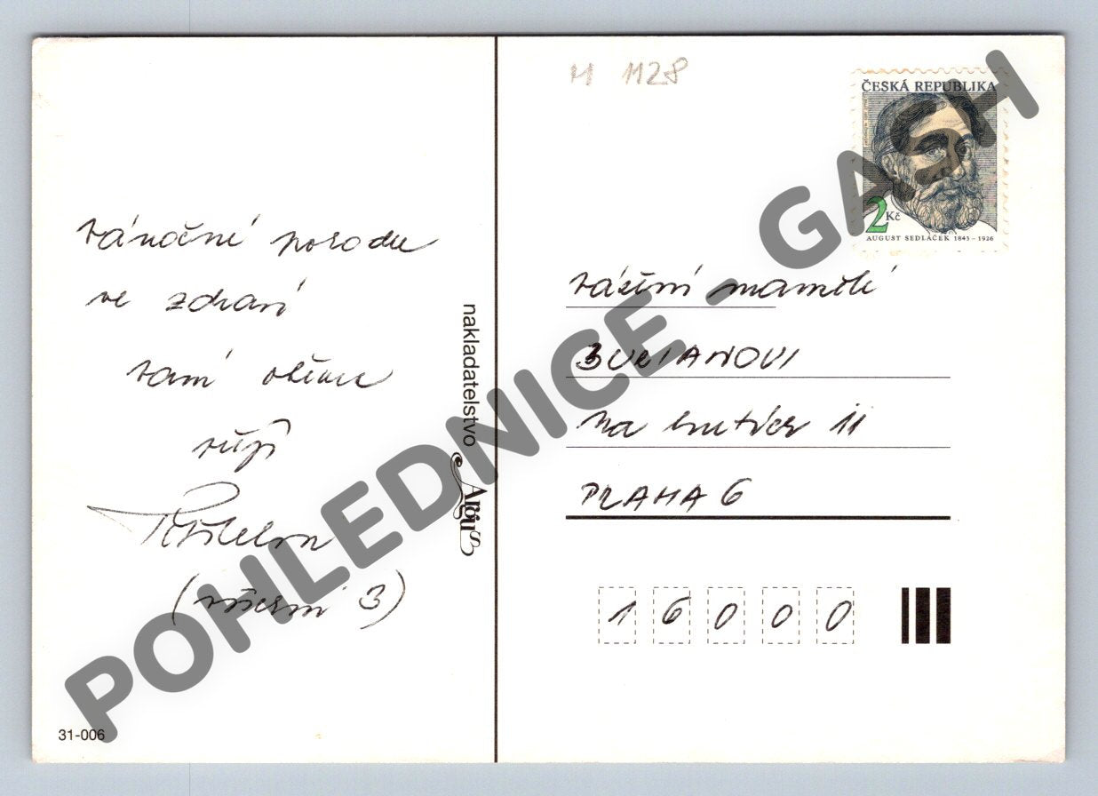 Nabízím originální pohlednici z České republiky s vánoční tematikou, zaslanou poštou a opatřenou známkou ČR s portrétem Augusta Sedláčka v hodnotě 2 Kč. Pohlednice je ve velkém formátu a pochází z období po roce 1950. Přední stranu zdobí veselý motiv sněhuláků s vánočními dárky, na zadní straně je ručně psaný vzkaz a adresa. Vhodné pro sběratele moderních českých pohlednic, jako vánoční dekorace nebo sběratelský kousek.