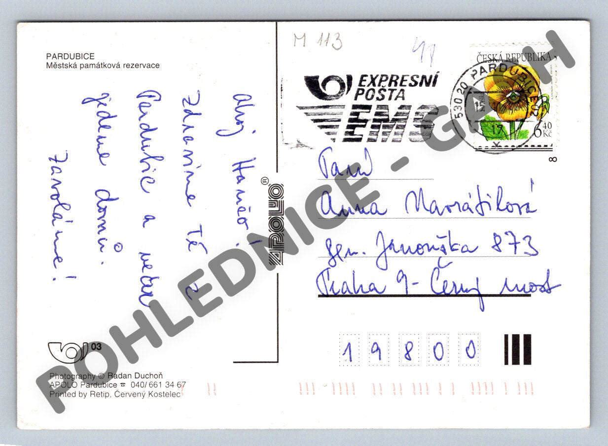 Originální pohlednice s motivem města Pardubice. Na přední straně je barevná fotografie historického centra Pardubic s výraznou architekturou a červenými střechami. Pohlednice obsahuje ručně psaný text a byla odeslána poštou. Na zadní straně se nachází poštovní razítko Pardubice, známka a adresa příjemce. Pohlednice je v zachovalém stavu, vhodná pro sběratele nebo jako dekorace. Jedná se o dobovou pohlednici vydanou společností APOLLO Pardubice, fotografie autor: Radan Duchoň.