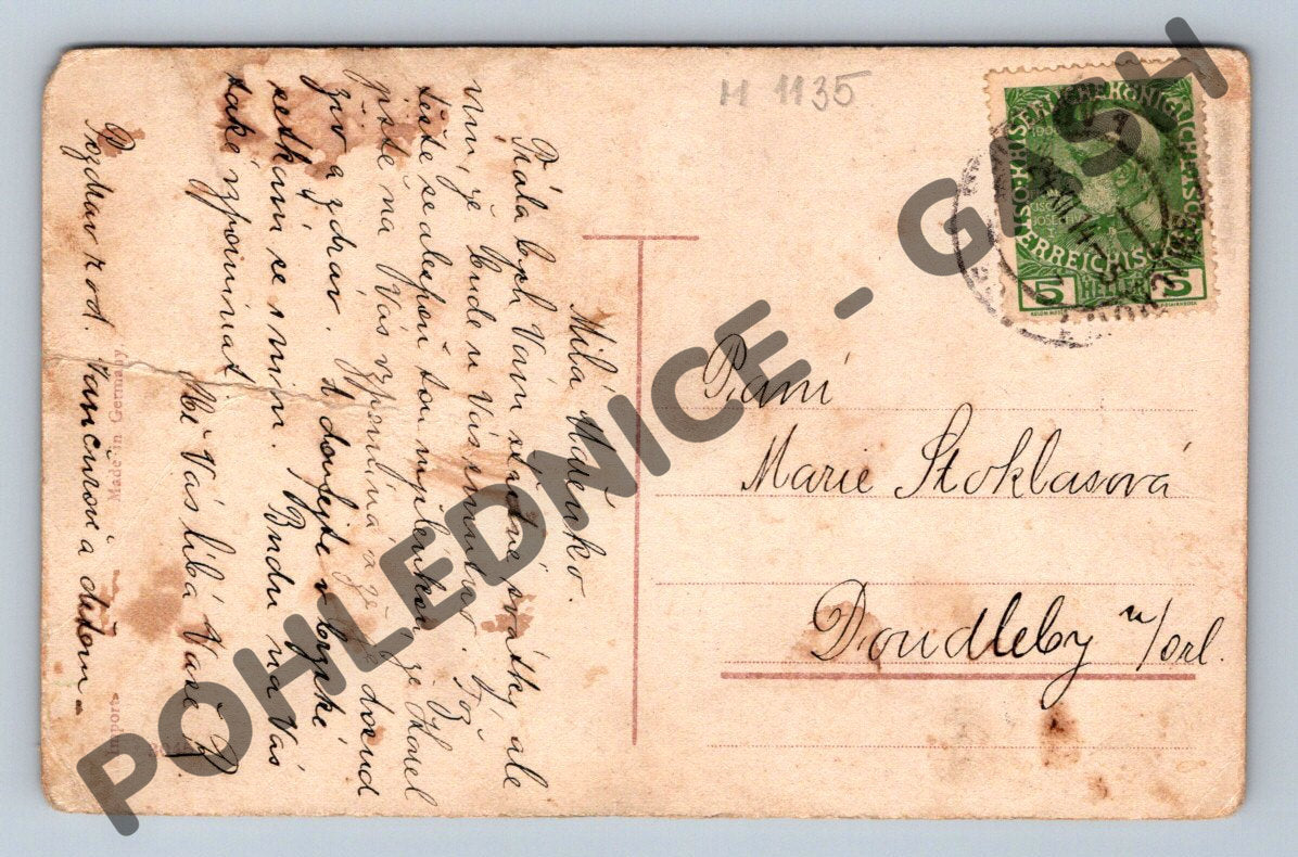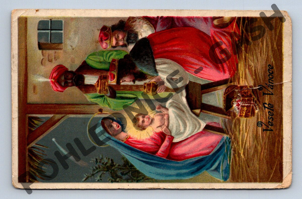 Starý vánoční pohled s motivem Narození Ježíše, zobrazuje tři krále, Marii a Ježíška ve stáji. Barevná litografická pohlednice s českým nápisem Veselé Vánoce. Pohled byl odeslán, nese rakouskou známku a osobní rukou psaný vzkaz adresovaný paní Marii Stoklasové do Doubledy. Stav pohlednice je odpovídající stáří – okraje jsou mírně opotřebené a je patrná patina a sklady. Skvělý sběratelský artikl pro milovníky historických vánočních pohlednic.