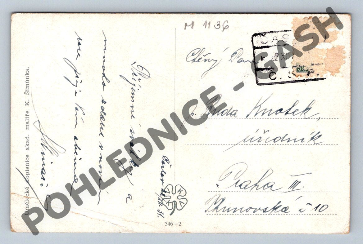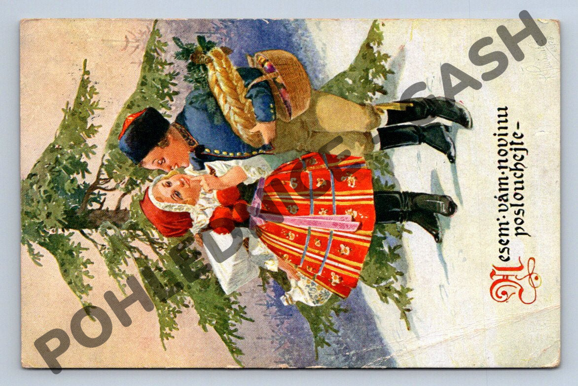 Krásná stará pohlednice s etnografickým námětem zachycující zimní venkovskou scénu s párem v kroji. Malovaný motiv typický pro období přelomu 19. a 20. století, autorem je akademický malíř K. Šimůnek. Text na pohlednici Písen vám novinu poslychejte . Pohlednice byla zaslána, včetně razítka a rukopisného textu, známka částečně zachovalá. Pohlednice nese znaky stáří a používání, drobné ohyby a opotřebení (viz foto). Jedná se o sběratelsky velmi zajímavý kus vhodný do kolekce tematicky zaměřené na lidové zvyky, etnografii či umělecké pohlednice.