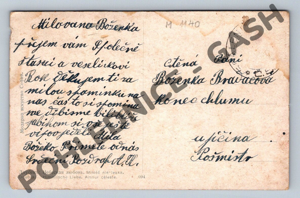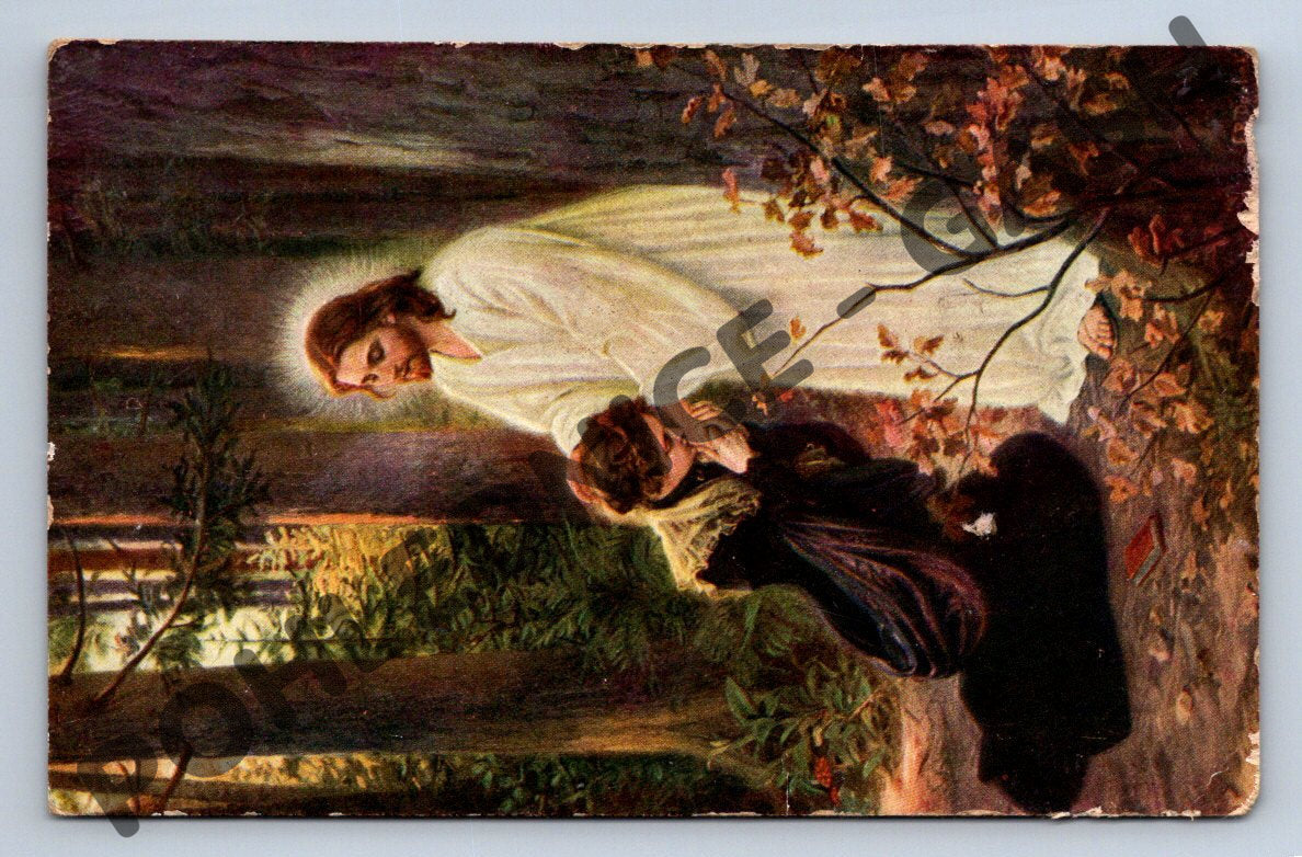 Starobylá pohlednice s náboženským motivem z období první poloviny 20. století. Na přední straně je krásná barevná kresba výjevu Nebešťanská láska - Milosť nebeská, která zobrazuje postavu Krista a ženu v lese. Rubová strana je popsána původním ručně psaným textem a opatřena razítkem. Pohlednice nese známky stáří a běžné opotřebení na okrajích, což jen podtrhuje její jedinečnost a sběratelskou hodnotu. Ideální přírůstek do sbírky pohlednic s malířskými a duchovními motivy.