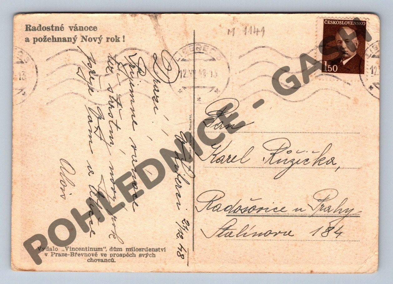 Vzácná stará pohlednice s motivem Narození Ježíše – Svatá rodina a andílci u jesliček. Jedná se o klasickou vánoční pohlednici odeslanou z Československa před rokem 1950, doplněnou poštovní známkou s portrétem T. G. Masaryka. Na zadní straně je ručně psané věnování s přáním Radostné vánoce a požehnaný Nový rok. Pohlednici vydalo Vincentinum, dům milosrdenství v Praze-Břevnově ve prospěch svých chovanců. Ve velmi dobrém sběratelském stavu, pouze drobné známky stáří a opotřebení na okrajích. Skvělý kus pro sběratele historických pohlednic, vánoční a náboženské tematiky. Rozměr klasického malého formátu.