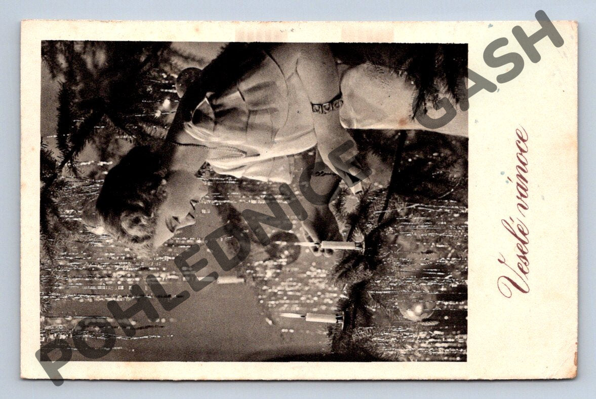 Starobylá černobílá pohlednice s vánočním motivem, v popředí mladá dívka u ozdobeného vánočního stromku, s nápisem Veselé vánoce . Na zadní straně je ručně psaný vzkaz a poštovní známka z období Protektorátu Čechy a Morava, datovaná 24. XII. 1939, razítko Třebíč. Pohlednice je v pěkném sběratelském stavu, s drobnými známkami stáří po okrajích. Formát zhruba odpovídá malému formátu pohlednic před rokem 1950. Skvělý přírůstek do sbírky historických pohlednic nebo jako zajímavý vánoční artefakt!