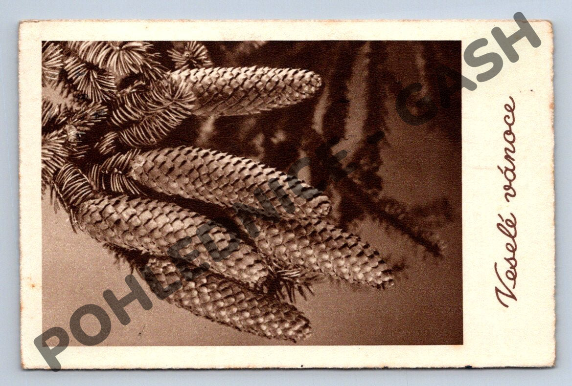 Starobylá černobílá pohlednice s vánočním motivem smrkových šišek a nápisem Veselé vánoce na přední straně. Zadní strana je popsána rukou a opatřena poštovní známkou z období Protektorátu Čechy a Morava s hodnotou 50h. Pohlednice byla odeslána do Říčan, datováno 1939. Skvělý sběratelský kousek s vánoční tematikou a historickou poštovní známkou, vhodný pro sběratele pohlednic z období první poloviny 20. století.